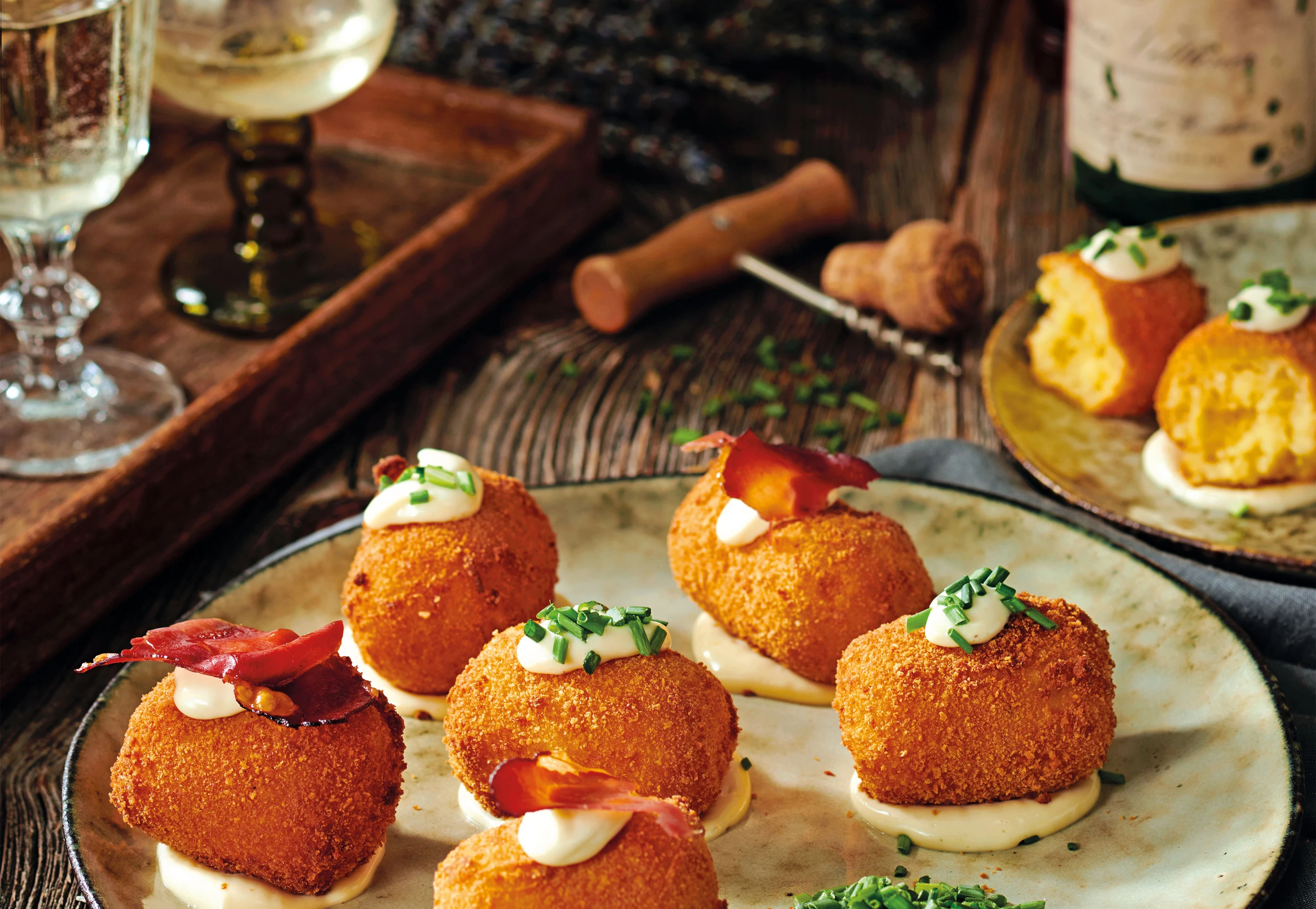 In einem Topf 4 Finger hoch Öl erhitzen. Kroketten darin goldbraun frittieren. Herausnehmen und auf einem Gitter abtropfen lassen. Schinken grob zerbröseln. Kroketten mit Mayonnaise, Schinkenbröseln und Schnittlauch servieren.