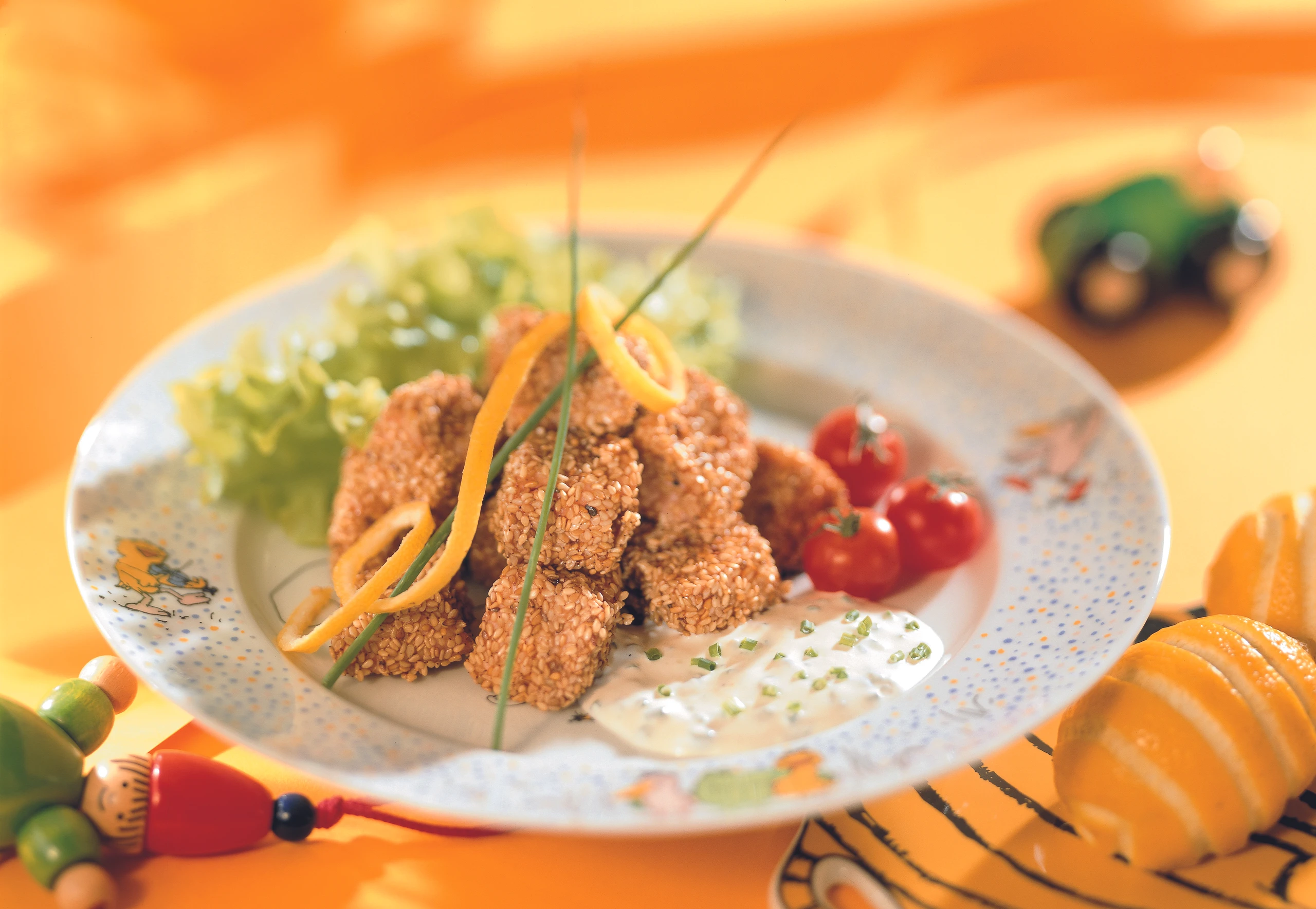 Nuggets in ca. 3 Finger hoch Öl goldgelb backen, auf Küchenpapier abtropfen lassen. Mit der Sauce und den Tomaten anrichten, mit Zitronenspiralen und Schnittlauchhalmen garnieren. Dazu passt Blattsalat.