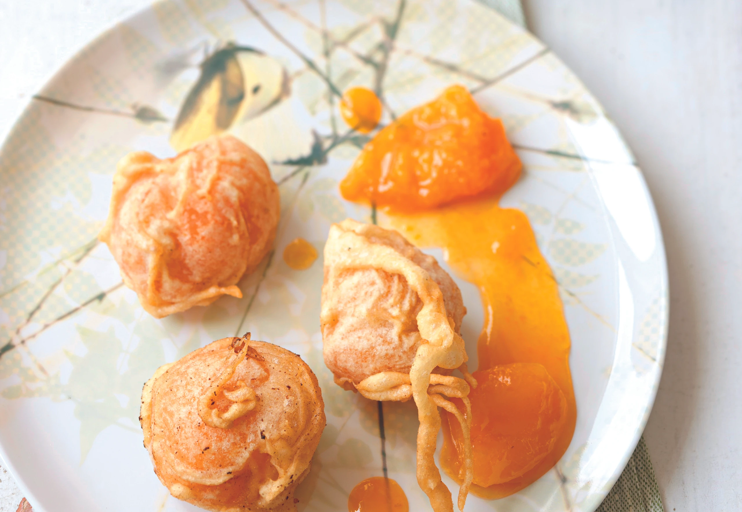 - Ca. 3 Finger hoch Öl erhitzen. Gefüllte Marillen in den Teig tauchen und im heißen Öl schwimmend goldgelb backen. Knödel mit einem Gitterlöffel herausnehmen und auf Küchenpapier abtropfen lassen. Knödel mit dem Marillenragout servieren.
