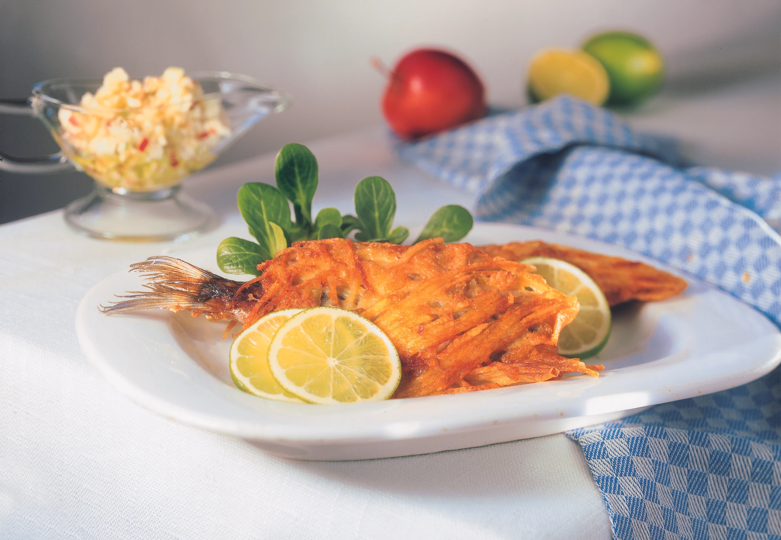 Die Hälfte der Heringsfilets in Mehl wenden, dann in die Erdäpfelmasse drücken (auf jeder Seite müssen ausreichend Erdäpfelstreifen haften bleiben). Erdäpfel leicht andrücken. In einer Pfanne die Hälfte vom Olivenöl erhitzen, Heringsfilets darin beidseitig goldbraun knusprig backen, aus der Pfanne heben und auf mehreren Lagen Küchenpapier gut abtropfen lassen. Heringe im vorgeheizten Rohr warm stellen. Die übrigen Heringsfilets ebenso zubereiten.