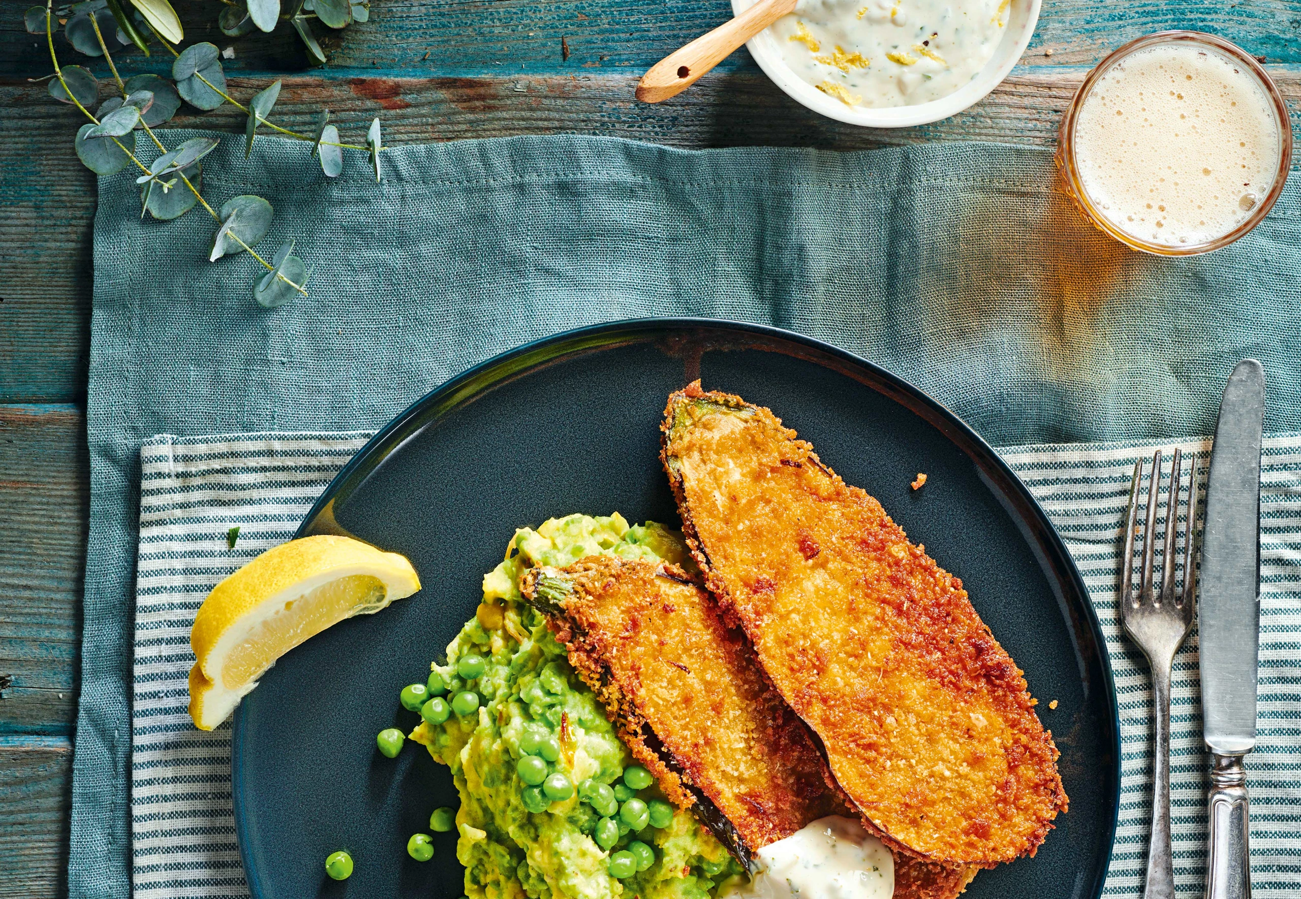 Knusprige Melanzanischnitzel auf Erbsenstampf
