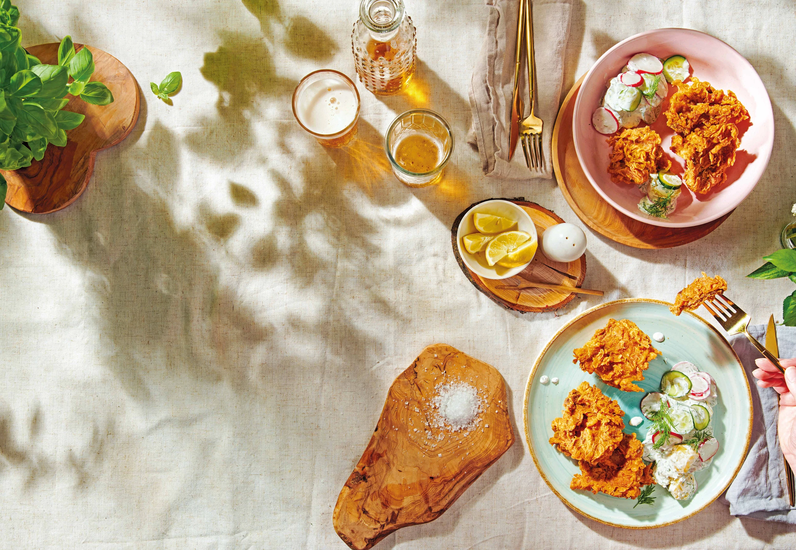 Für den Salat Erdäpfel kochen, schälen, auskühlen lassen und in Scheiben schneiden. Gurken und Radieschen putzen und in dünne Scheiben schneiden. Mit Salz würzen und ca. 20 Minuten ziehen lassen. Gemüse vorsichtig ausdrücken. Sauerrahm, Dille, Zitronenschale und -saft verrühren. Erdäpfel, Gurken und Radieschen untermischen. Mit Salz und Pfeffer abschmecken.