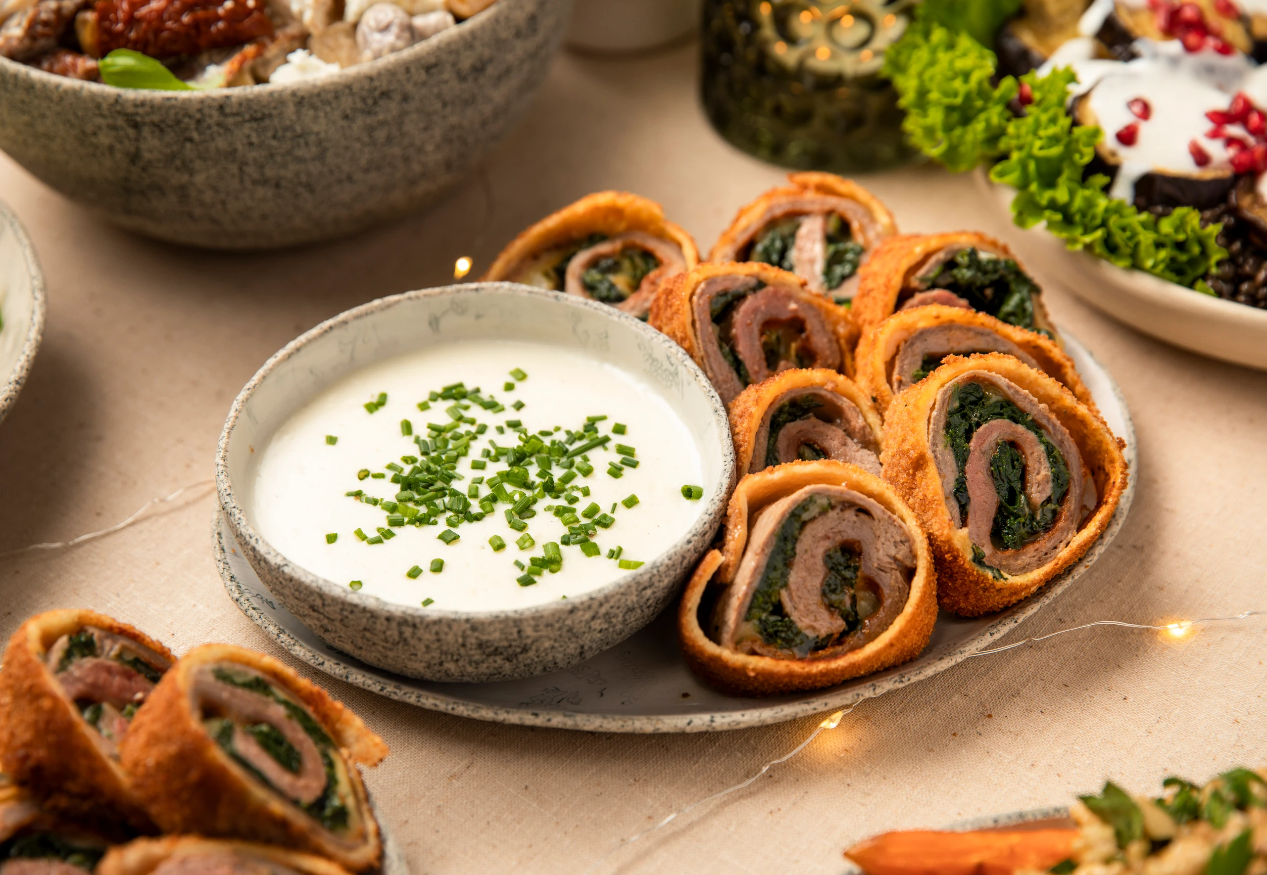 Steakrouladen aus dem Rohr nehmen, aufschneiden. Mit der mit Schnittlauch bestreuten Sauce servieren.