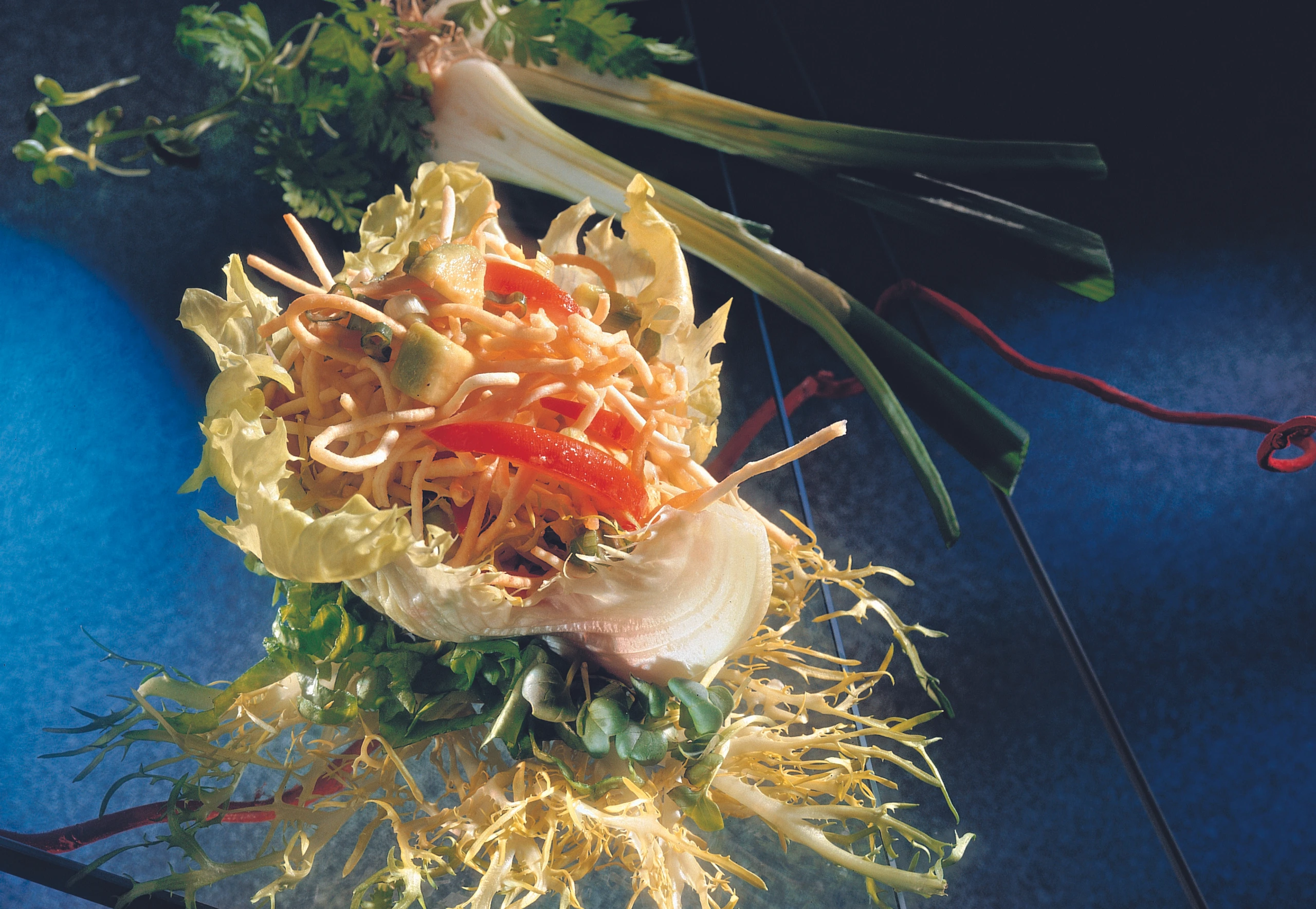 Marinierte Salate auf Tellern anrichten, mit dem reservierten Salatblatt belegen und darauf den Nudelsalat anrichten. Eventuell mit Kresseblättchen garnieren.