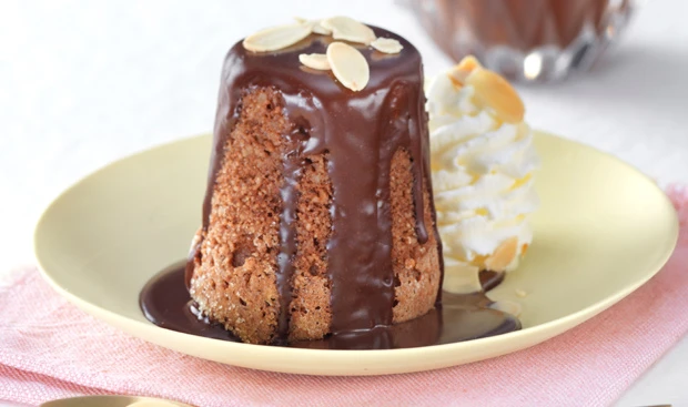 - Förmchen aus dem Rohr nehmen. Kuchen auf Teller stürzen, mit Sauce übergießen, mit Obers und Mandeln garniert servieren.
