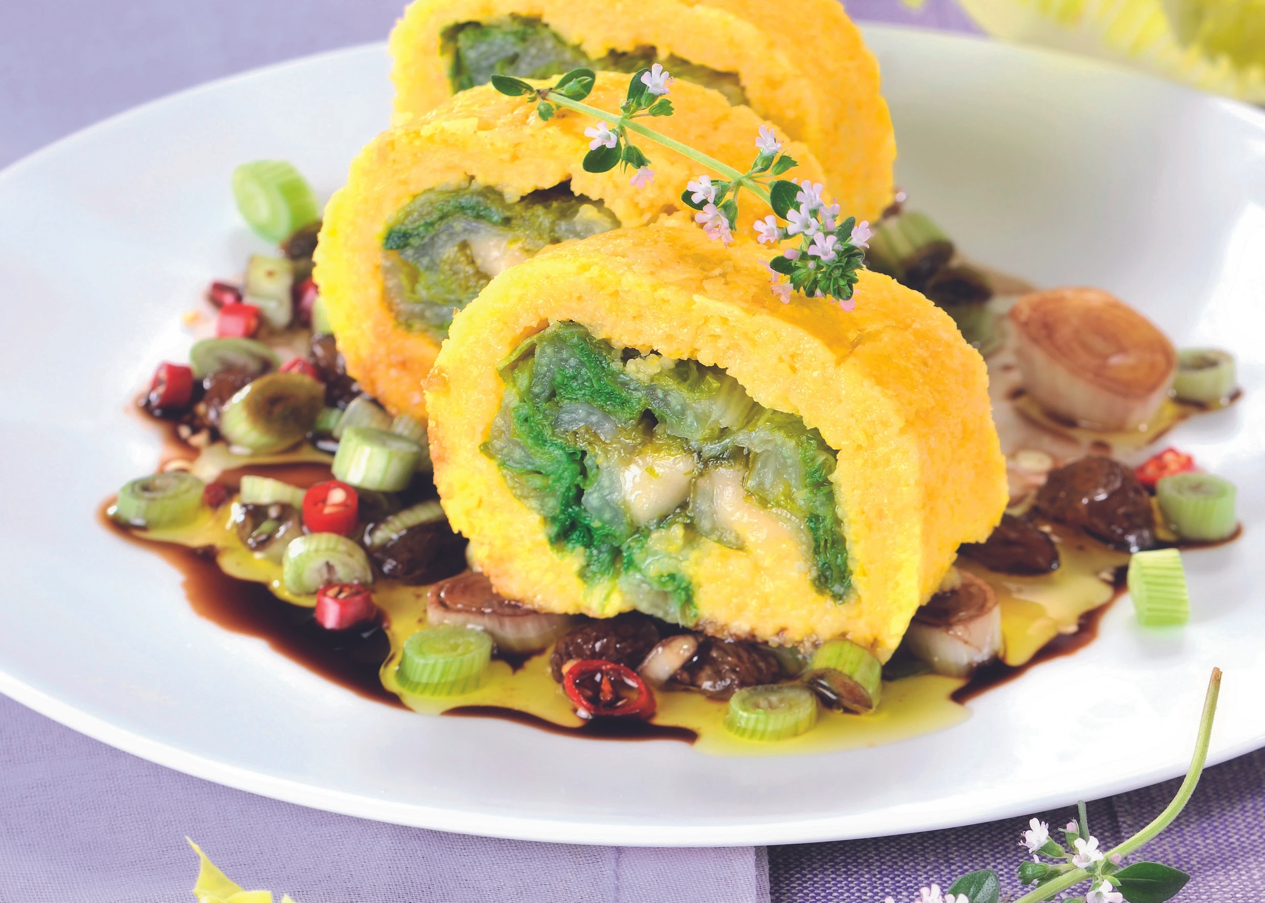 Kochsalatroulade mit Polenta und Rosinen-Chili-Marinade