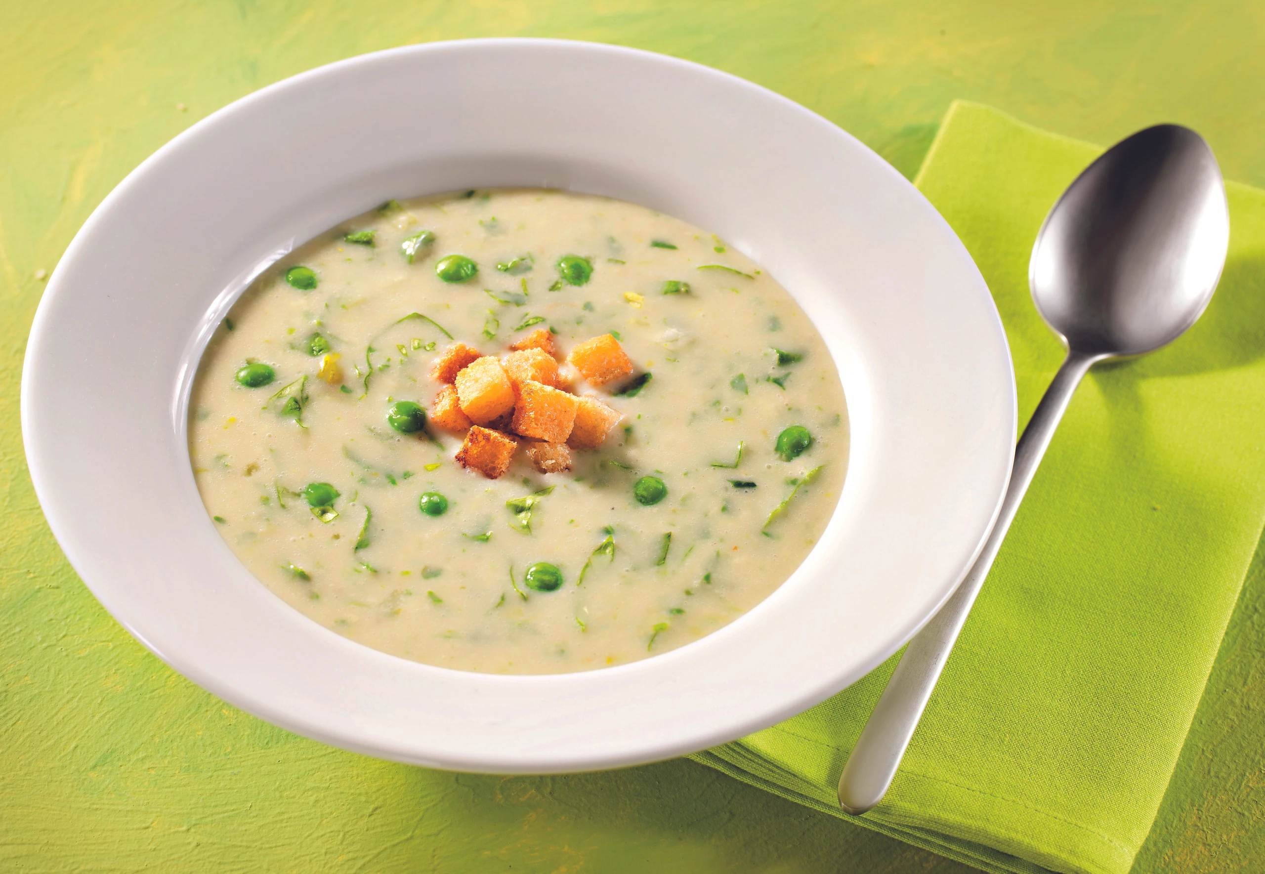 - Mehl in Butter anschwitzen, mit Wein und Suppe aufgießen, gut verrühren und auf-kochen. Salat in die Suppe geben, ca. 10 Minuten köcheln. Gegen Ende der Garzeit Obers zugießen. Suppe mit dem Stabmixer pürieren. Erbsen und reservierten Salat in die Suppe rühren, aufkochen, mit Salz, Pfeffer und Muskat würzen. Suppe anrichten und mit den Brotwürfeln bestreut servieren.