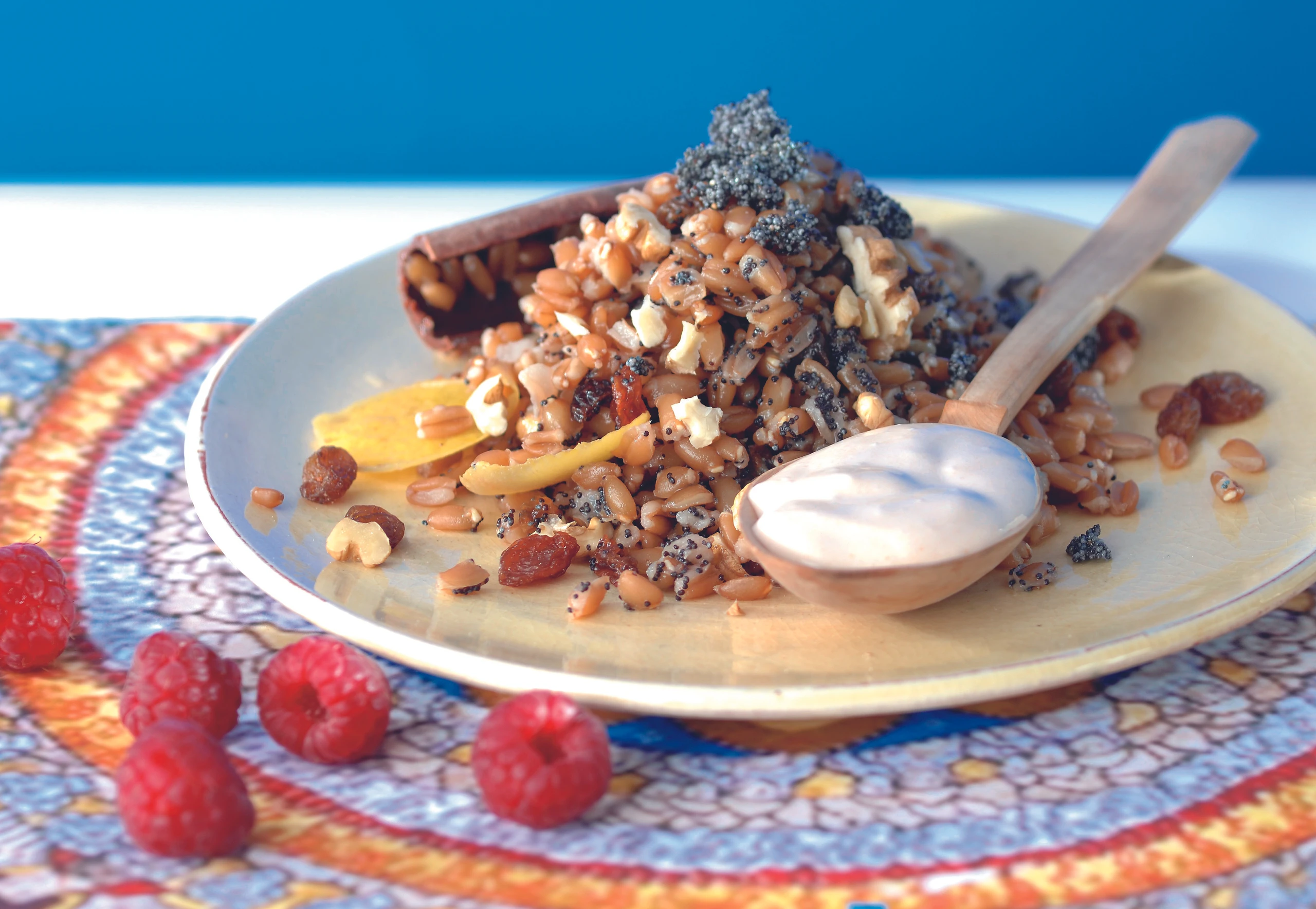 Dinkel in kaltem Wasser waschen, abseihen und abtropfen lassen. 700 ml Wasser mit Zimtstange, Nelke und Zitronenschale aufkochen. Dinkel darin bei schwacher Hitze weich kochen (ca. 1 Stunde). Dinkel abseihen und abtropfen lassen.