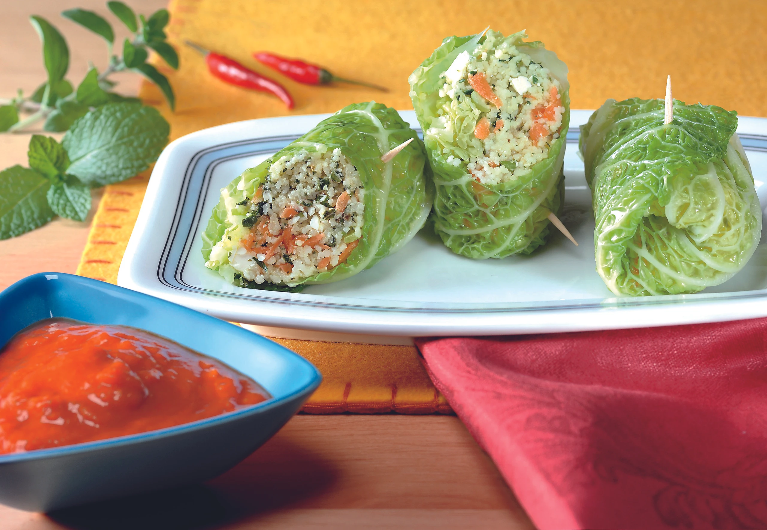 Kohl-Wraps mit Couscous-Fülle und Paprikasauce