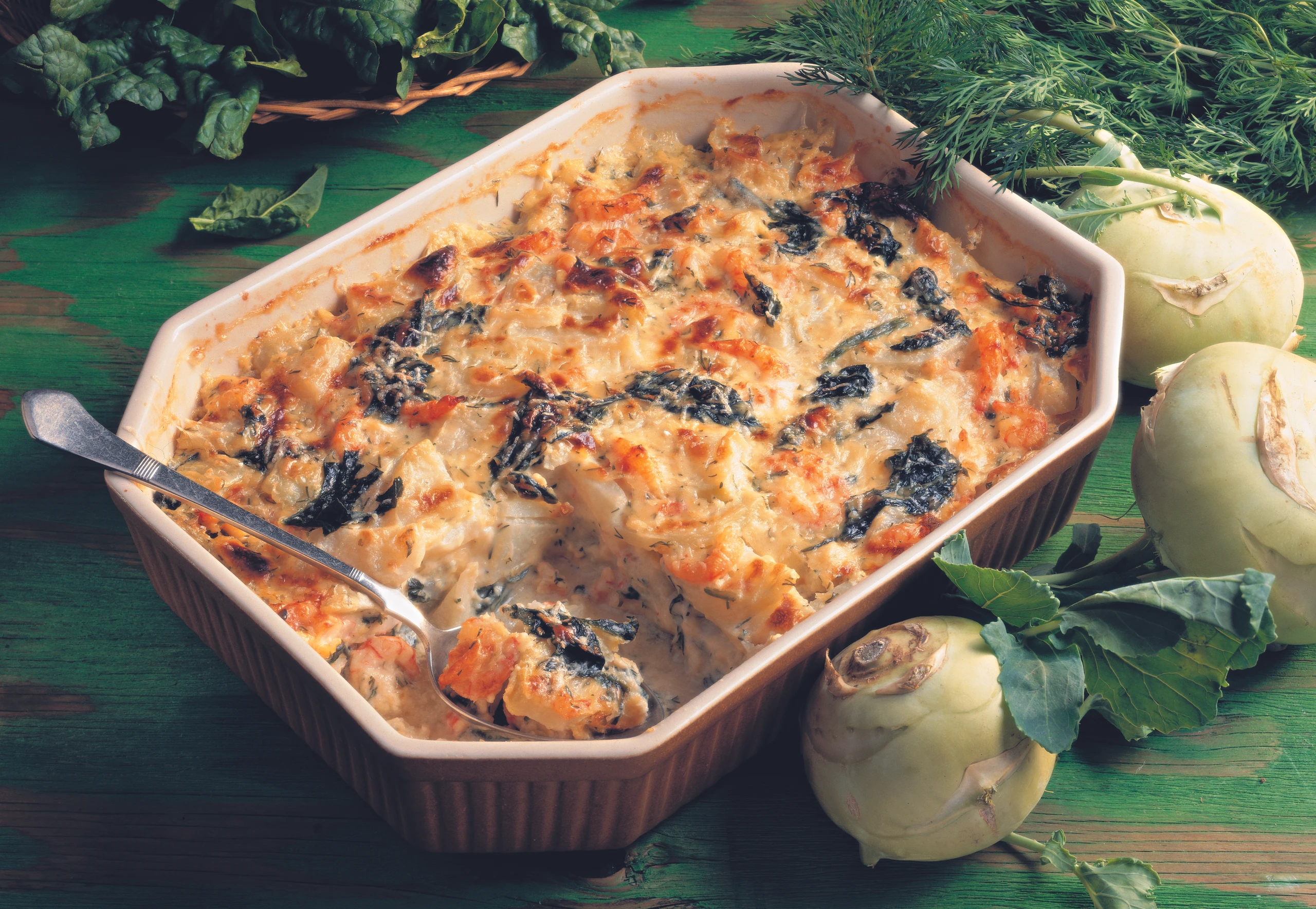 Dotter, Käse, Kohlrabi, Shrimps, Spinatstreifen und Dille in die Sauce rühren. Gemüsemischung in die Form füllen, glatt verstreichen und im vorgeheizten Rohr (mittlere Schiene / Gitterrost) ca. 40 Minuten backen.