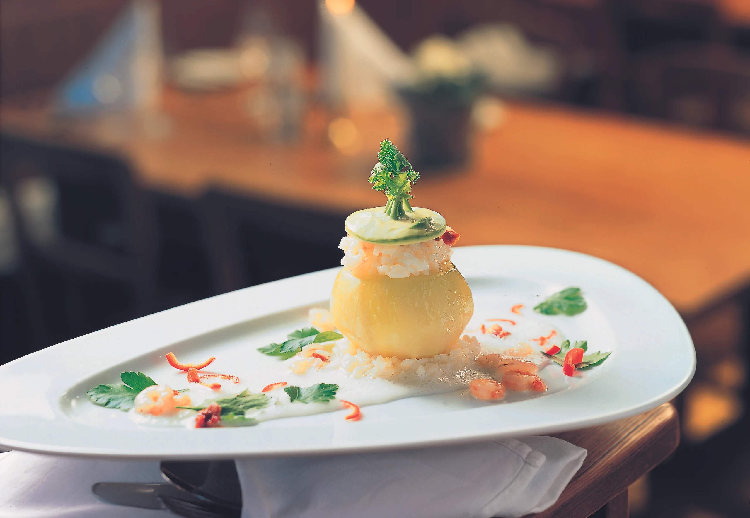 Kohlrabi im Kochfond erwärmen, mit dem Risotto füllen und die Deckel aufsetzen. Mit frischer Petersilie und klein geschnittenem Chili garnieren.