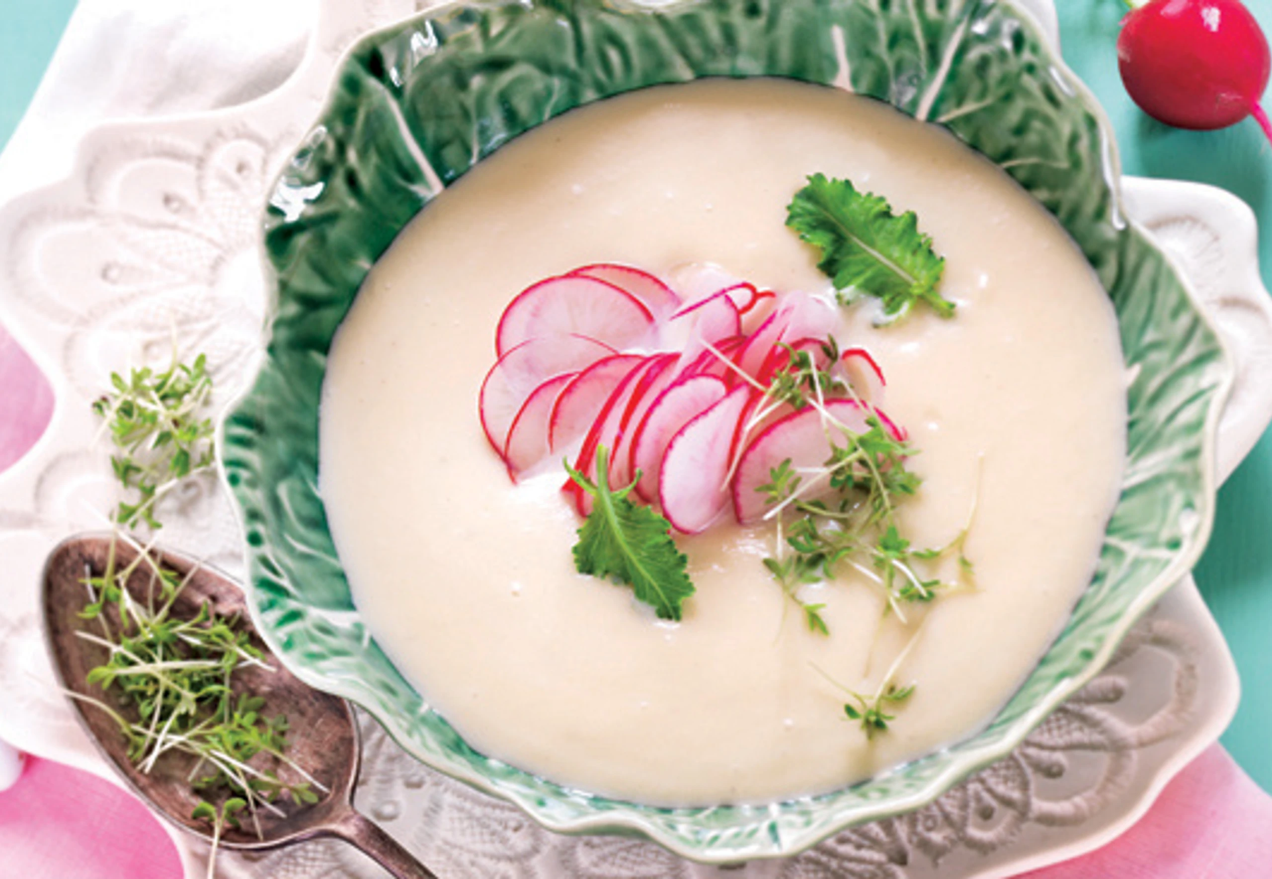 Für die Garnitur Radieschen putzen und in dünne Scheiben, Kresse von den Stielen schneiden. Suppe mit Radieschen und Kresse anrichten, mit den abgetropften Kohlrabiblättchen garnieren.