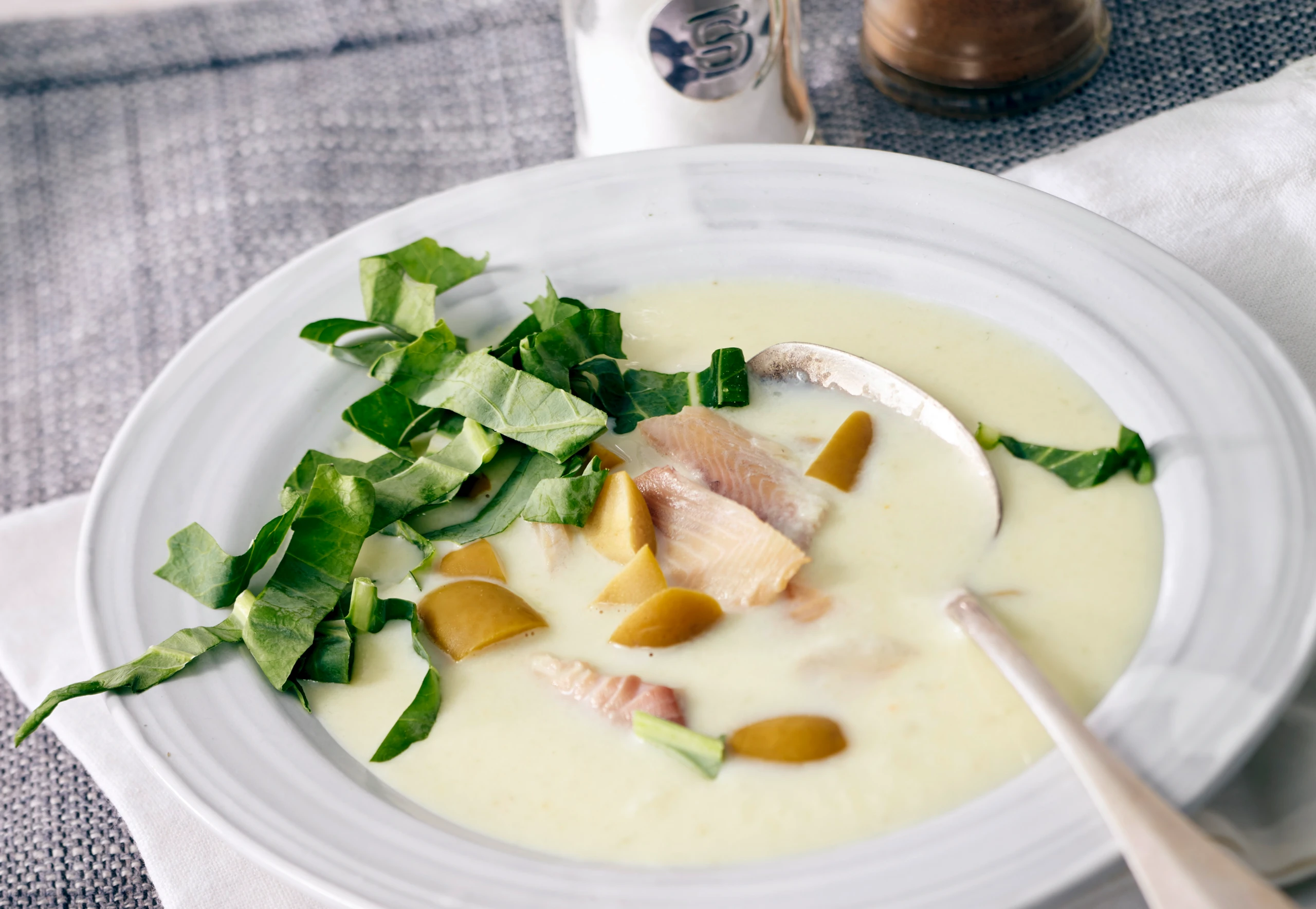Obers zugießen, Suppe einmal aufkochen, mit einem Stabmixer pürieren, mit Salz, Pfeffer und Zitronensaft würzen. Suppe mit Forelle, Oliven und Kohlrabigrün bestreut servieren.