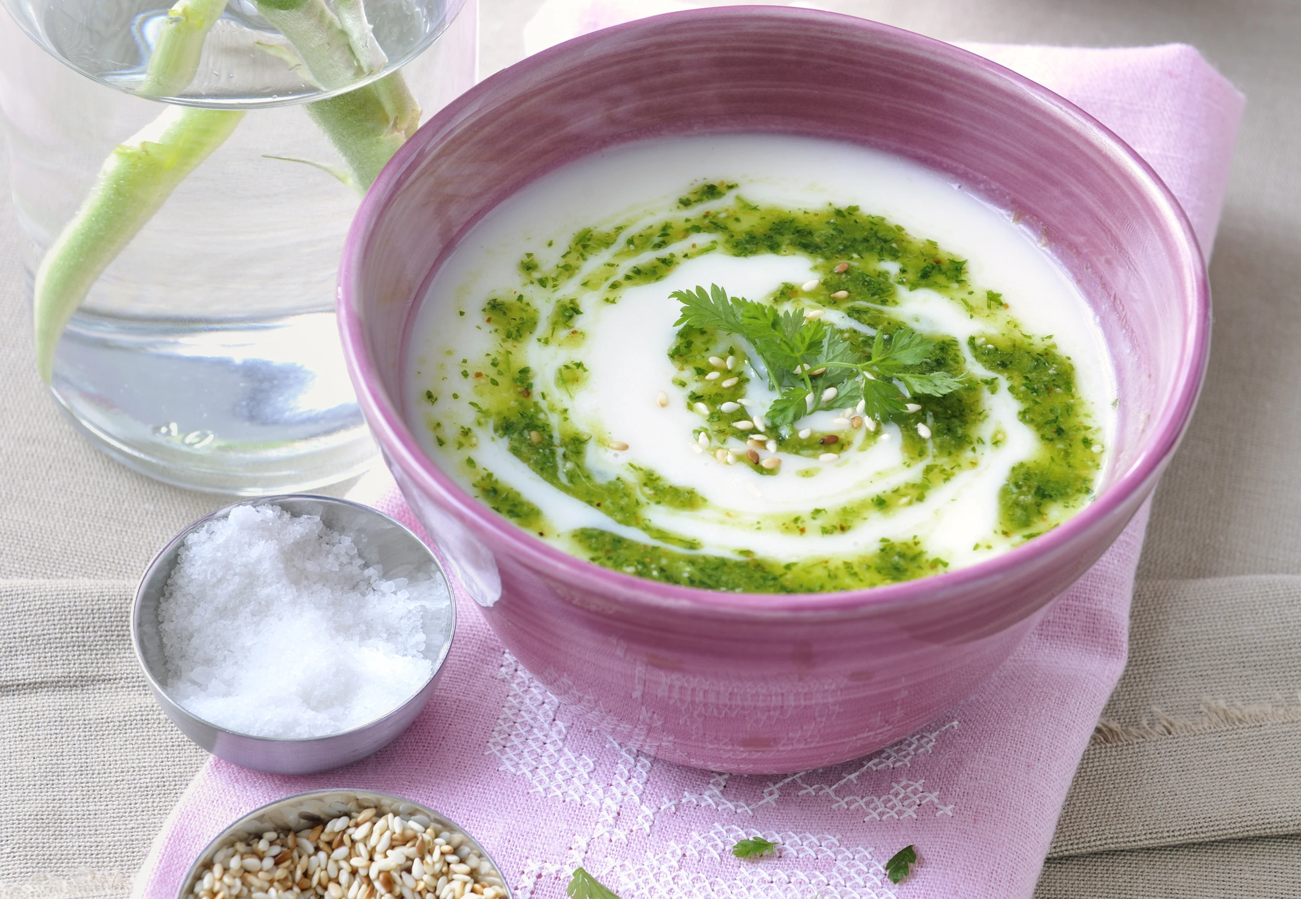 Suppe anrichten und mit Pesto beträufeln, eventuell mit Kerbelblättchen und Sesam garnieren.