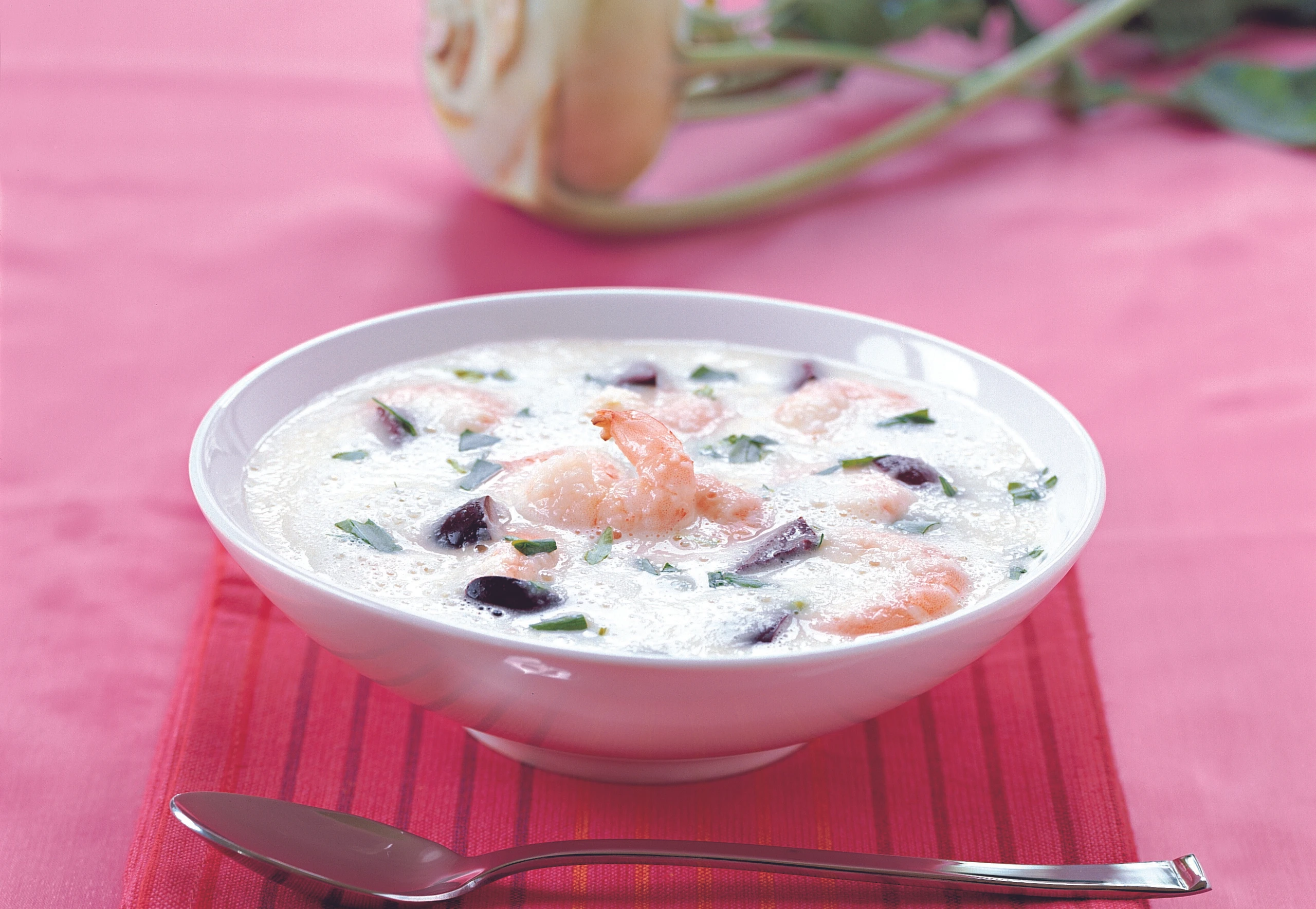 Obers in die Suppe gießen. Suppe aufkochen, fein pürieren, mit Salz, Pfeffer und Zitronensaft würzen. Shrimps und Oliven einrühren und erwärmen. Suppe mit Estragon garniert servieren.