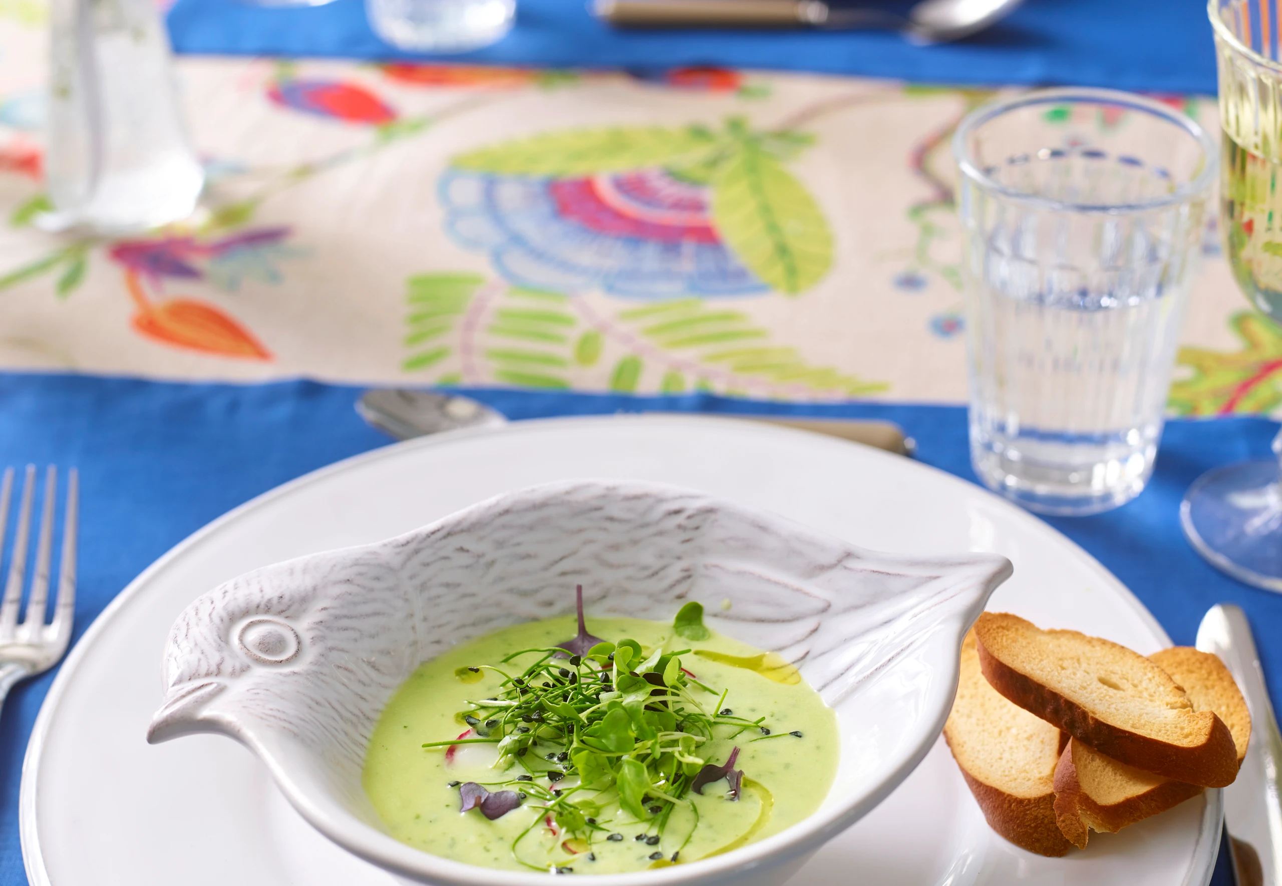 Crème fraîche in die Suppe rühren. Suppe aufkochen, mit Salz, Pfeffer, Muskat und Zitronensaft würzen. Kohlrabiblätter einrühren, Suppe aufkochen und pürieren.