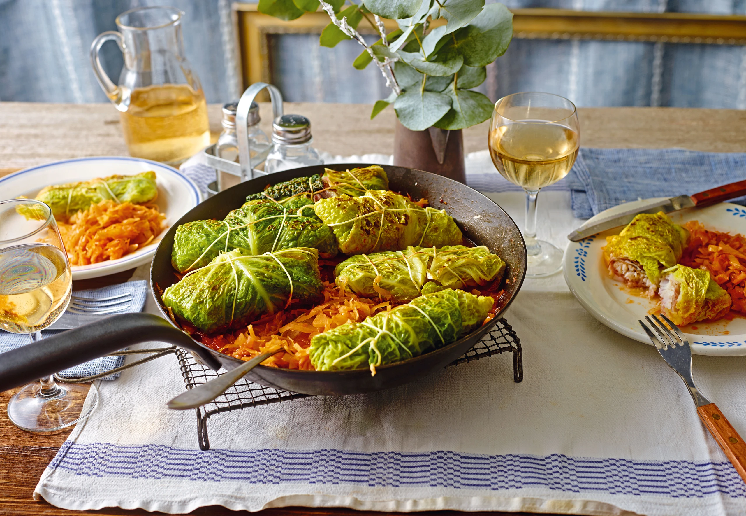 Kohlröllchen auf das Kraut legen und bei mittlerer Hitze ca. 25 Minuten dünsten. Nach halber Garzeit Röllchen wenden. Röllchen mit dem Kraut anrichten und servieren.
