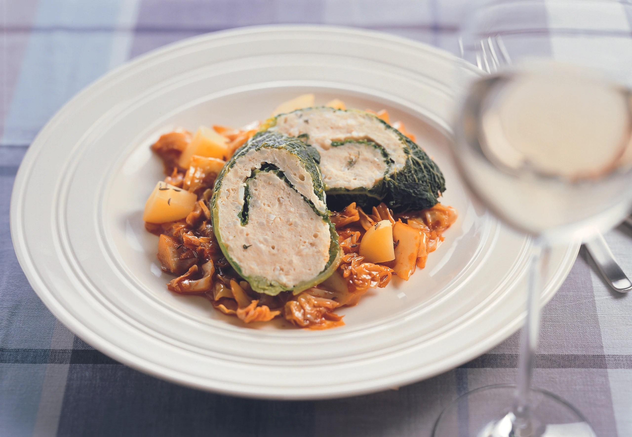 Kohlroulade mit Fischfülle und Paprikakraut mit Erdäpfel