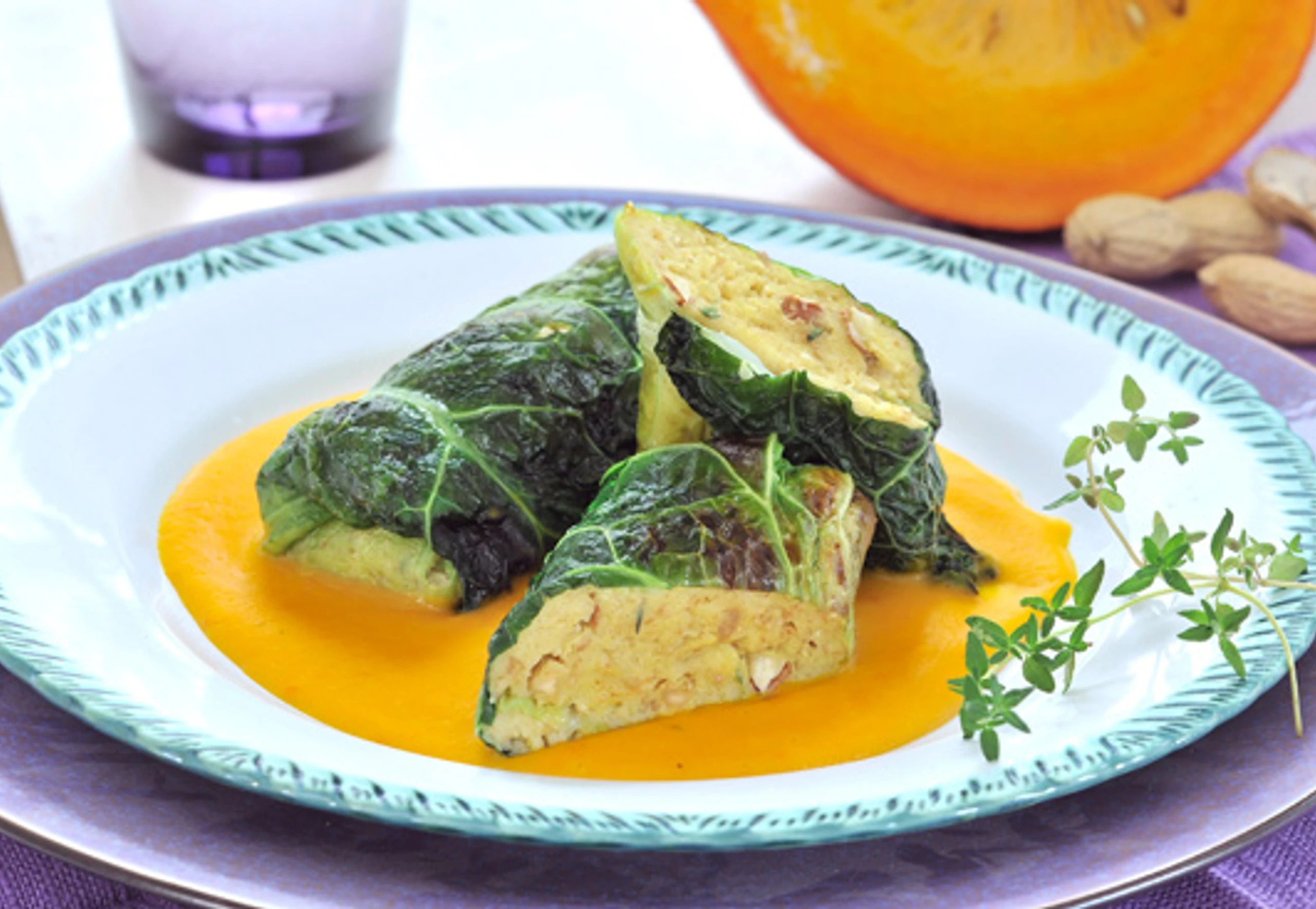 Erdäpfel abseihen, gut abtropfen lassen und durch eine Flotte Lotte passieren. Masse kurz überkühlen lassen, mit gehackten Kohlabschnitten, Erdnüssen, Dottern, Mehl, Thymian und Salz vermischen. Masse auf den Kohlblättern verteilen. Blätter seitlich einschlagen und über die Fülle einrollen.