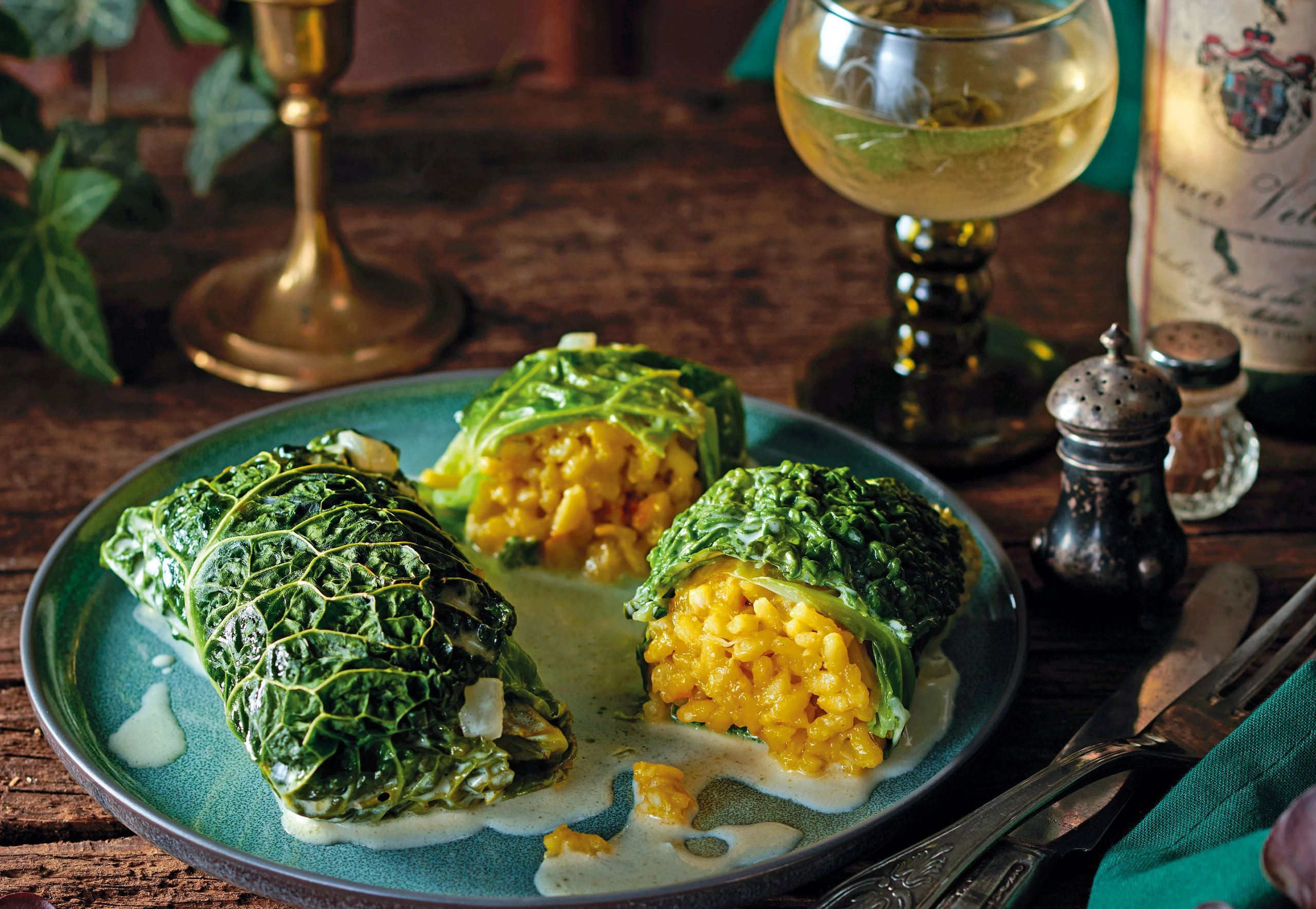 Eine Auflaufform mit Butter ausstreichen. Kohlblätter auf die Arbeitsplatte legen und das Risotto darauf verteilen. Blätter links und rechts einschlagen und über die Fülle nach oben einrollen. Mit der Naht nach unten in die Auflaufform setzen. Rohr auf 180°C vorheizen.