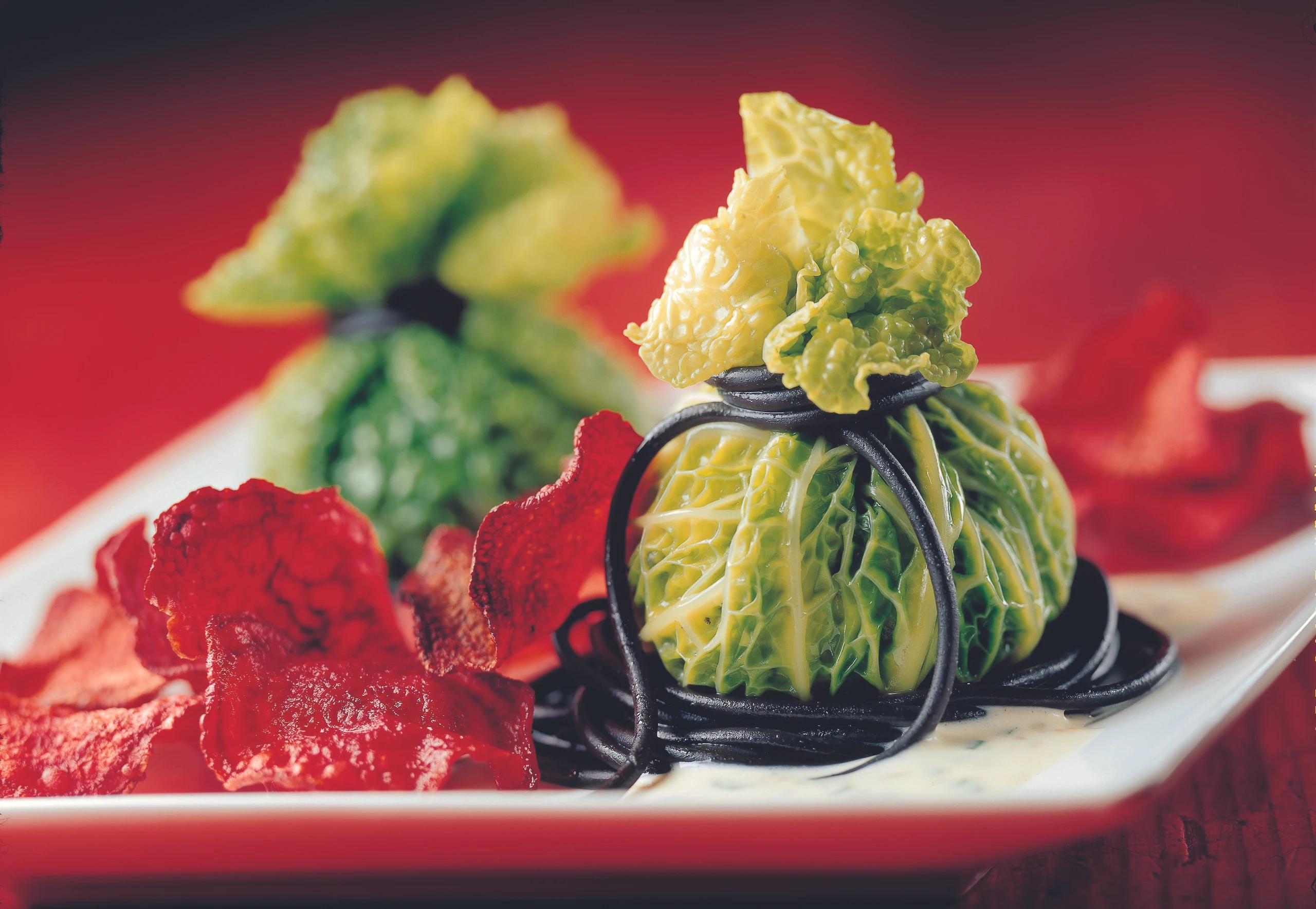 Kohlsäckchen aus dem Rohr nehmen und mit der Sauce, den restlichen Spaghetti und der Garnitur (siehe Rezepte) anrichten.