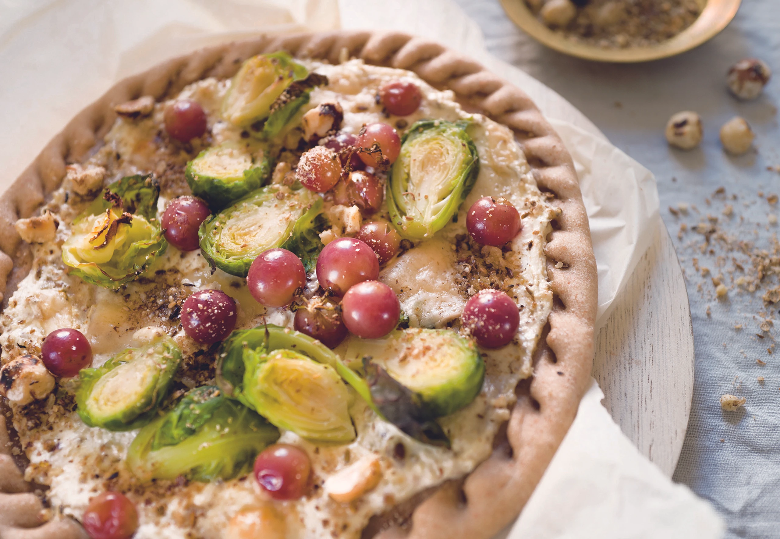 Für den Belag Ricotta, Ei und Dukkah glatt rühren, mit Salz und Pfeffer würzen. Masse auf den Boden streichen. Kohlsprossen halbieren. Tarte mit Kohlsprossen und Weintrauben belegen, mit Dukkah und Parmesan bestreuen.