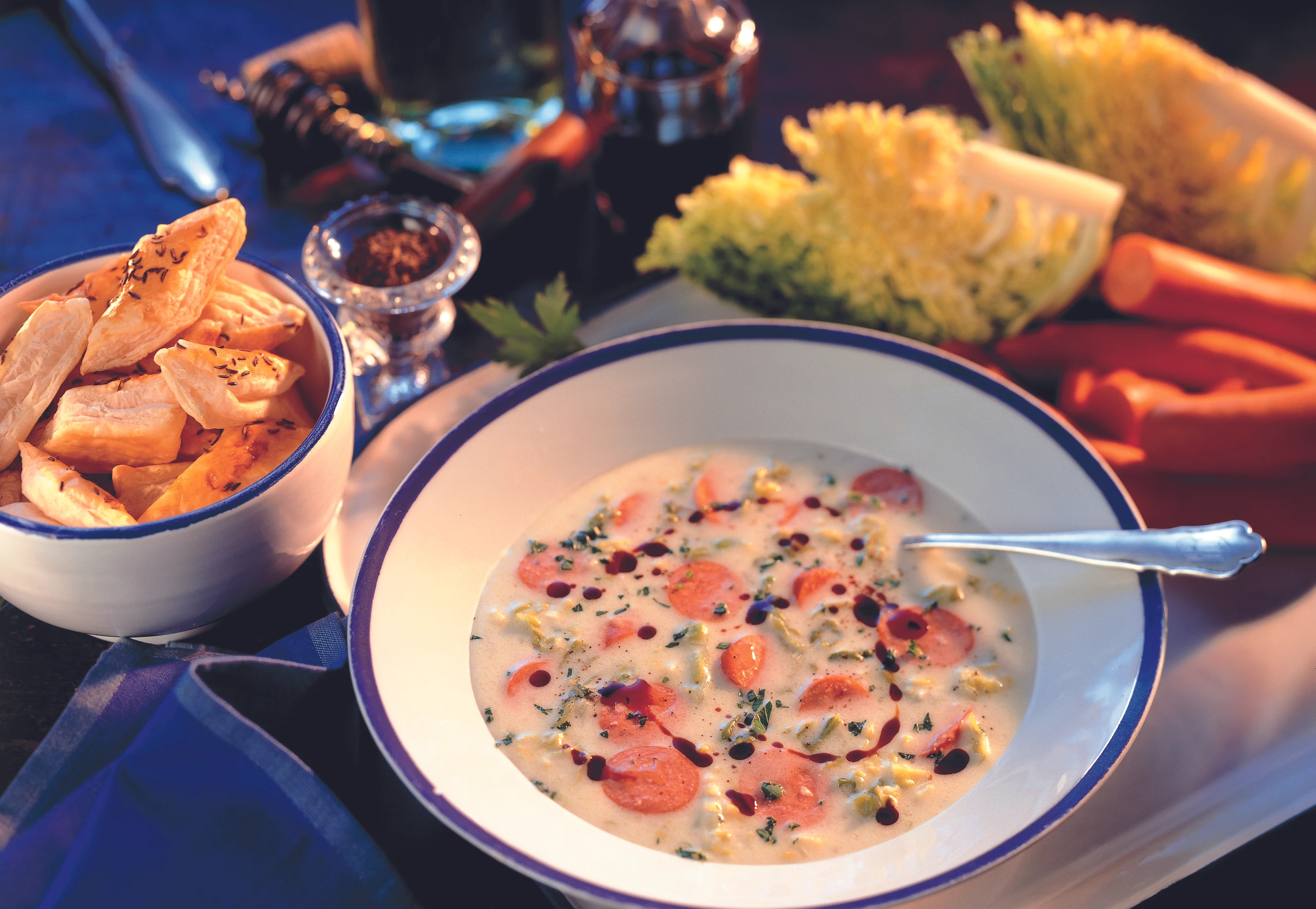 Zwiebel, Knoblauch und Kohlstreifen in Butter anschwitzen, mit Suppe aufgießen und bei schwacher Hitze ca. 10 Minuten köcheln. Sauerrahm mit Mehl verquirlen und in die Suppe rühren. Suppe mit Salz, Pfeffer und Kümmel würzen und weitere 6 Minuten kochen.