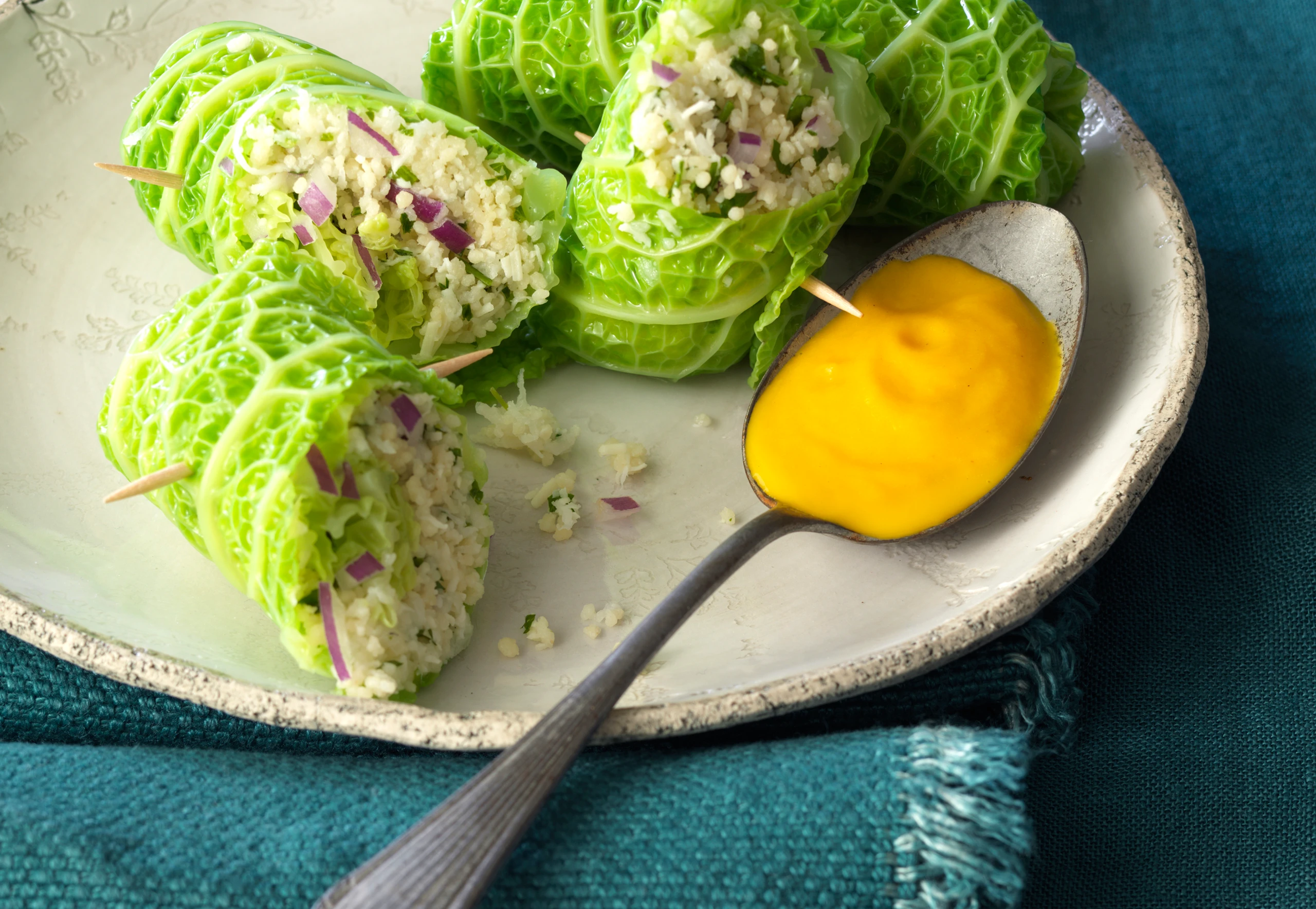 In die Mitte der Kohlblätter je ca. 50 g Fülle setzen. Kohlblätter seitlich etwas einschlagen, längs aufrollen, mit Zahnstochern zusammenstecken, halbieren und mit der Karottensoße anrichten.