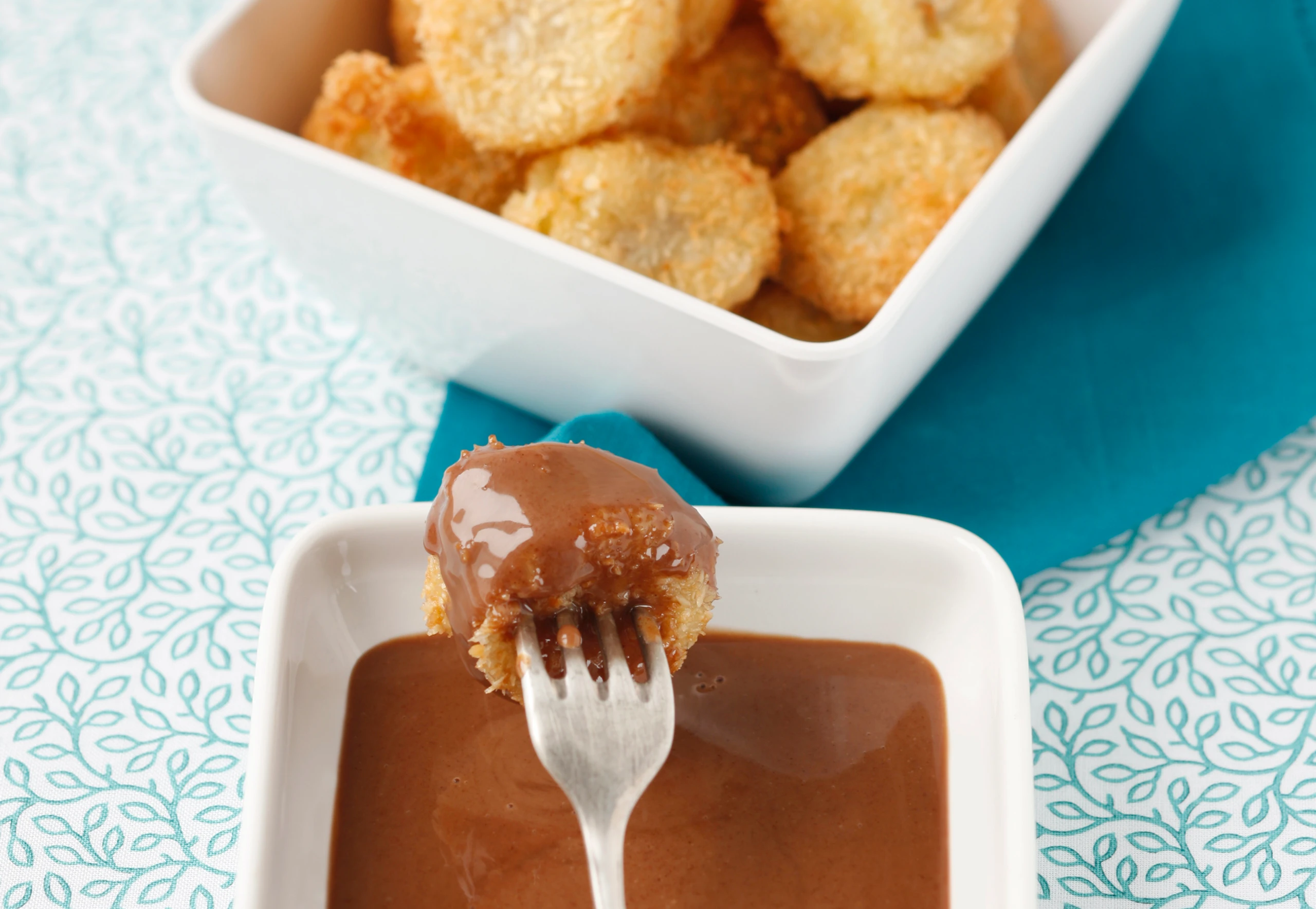 Ca. 3 Finger hoch Öl erhitzen. Bananen darin schwimmend goldbraun backen, herausheben und auf Küchenpapier abtropfen lassen. Bananen mit der Sauce anrichten.