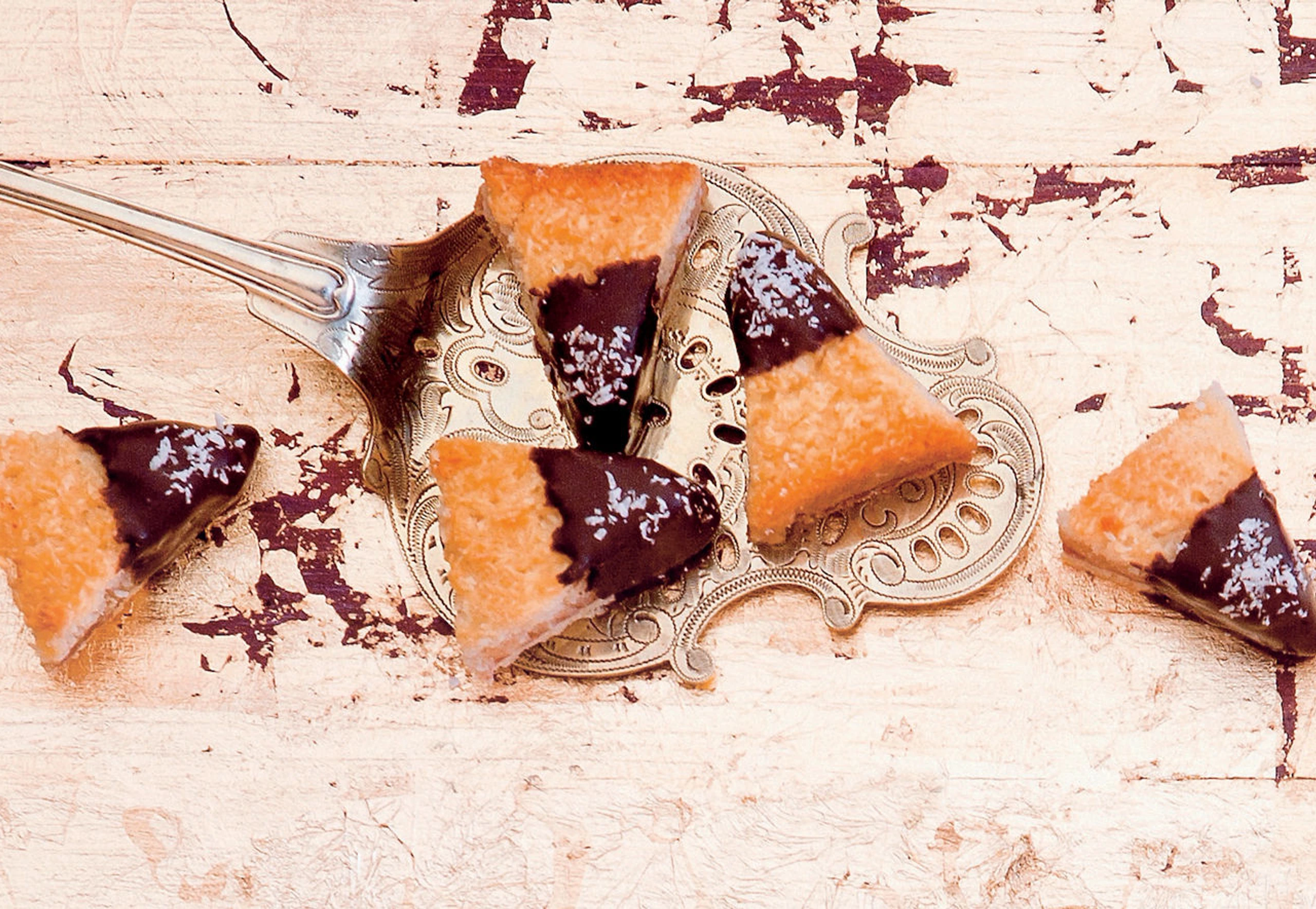 Für die Kokosmasse alle Zutaten über Dampf verrühren und erhitzen. Masse vom Dampf nehmen, überkühlen lassen und auf dem Marzipan verstreichen. Masse im Rohr 15–20 Minuten backen. Herausnehmen, 1 Stunde auskühlen lassen, in Dreiecke schneiden und in Schokolade tunken.