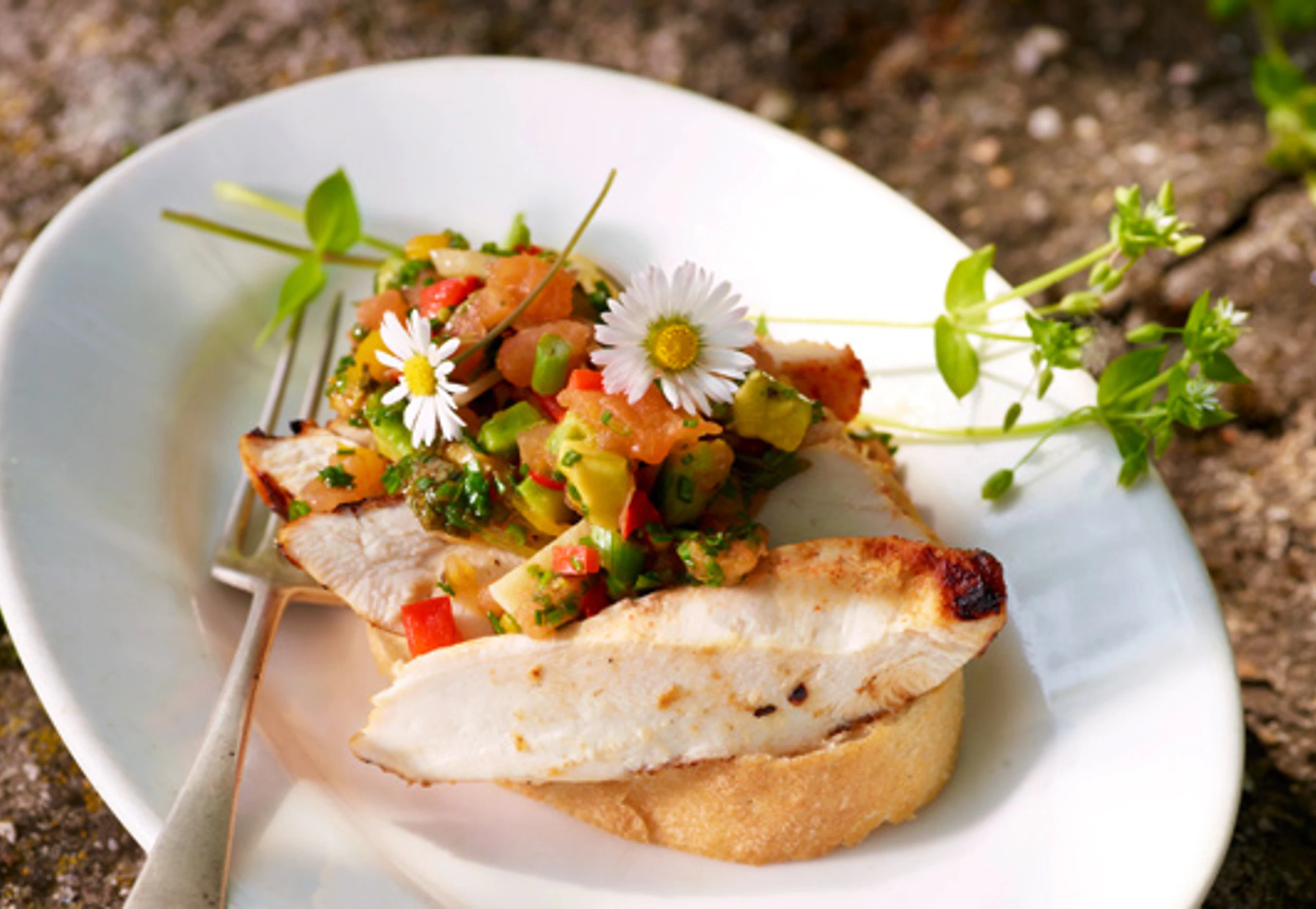 Ciabatta mit Öl beträufeln und auf dem Grill kurz toasten. Fleisch in dünne Streifen schneiden, auf dem Brot mit der Salsa anrichten.