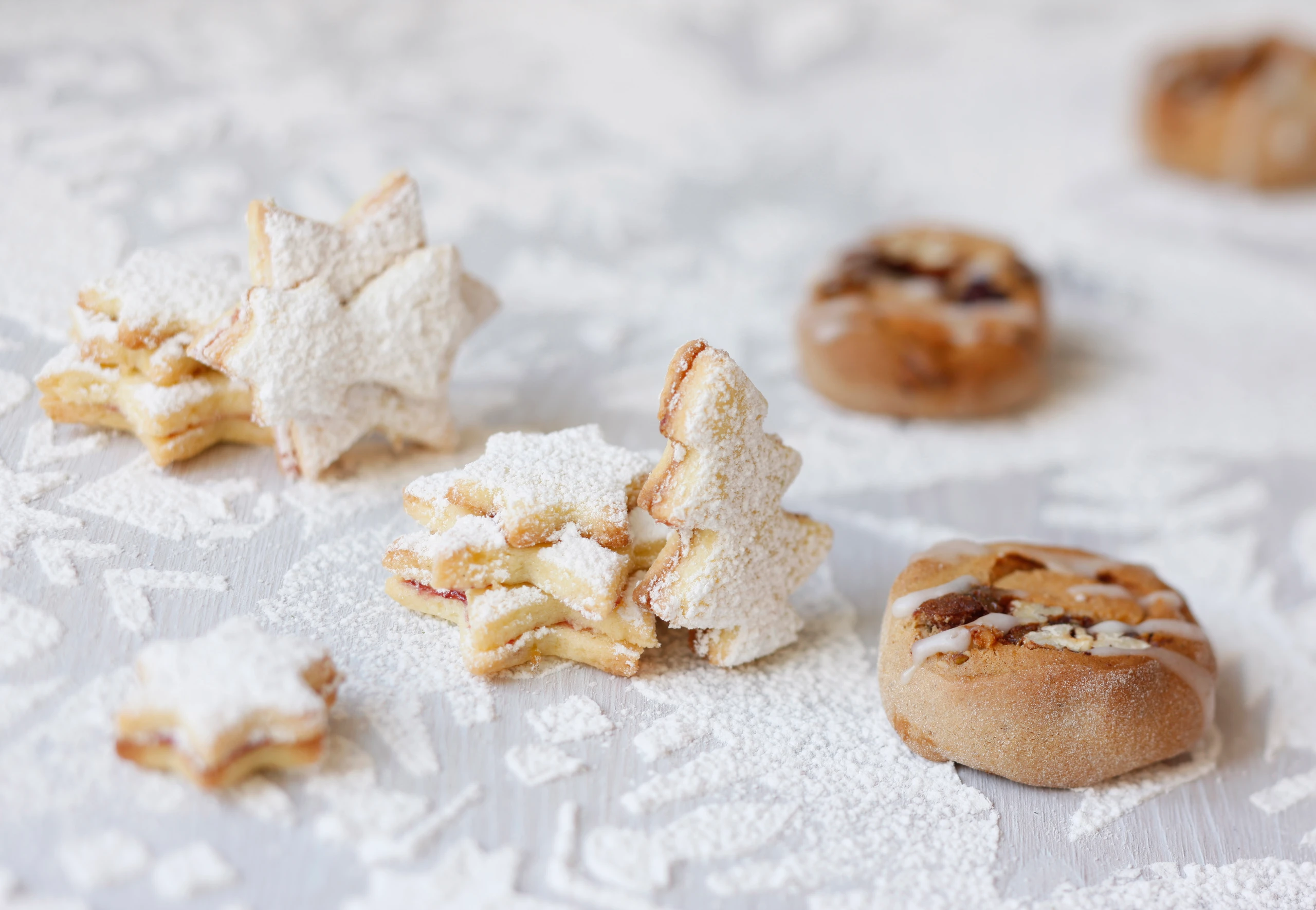 Rohr auf 200°C vorheizen. 3 Backbleche mit Backpapier belegen. Teig zwischen Frischhaltefolie ca. 4 mm dick ausrollen. Aus dem Teig Sterne (Ø 3 und 4 cm) oder Bäume stechen und mit etwas Abstand auf die Bleche geben. Kekse im Rohr (mittlere Schiene) goldgelb backen (ca. 6 Minuten).