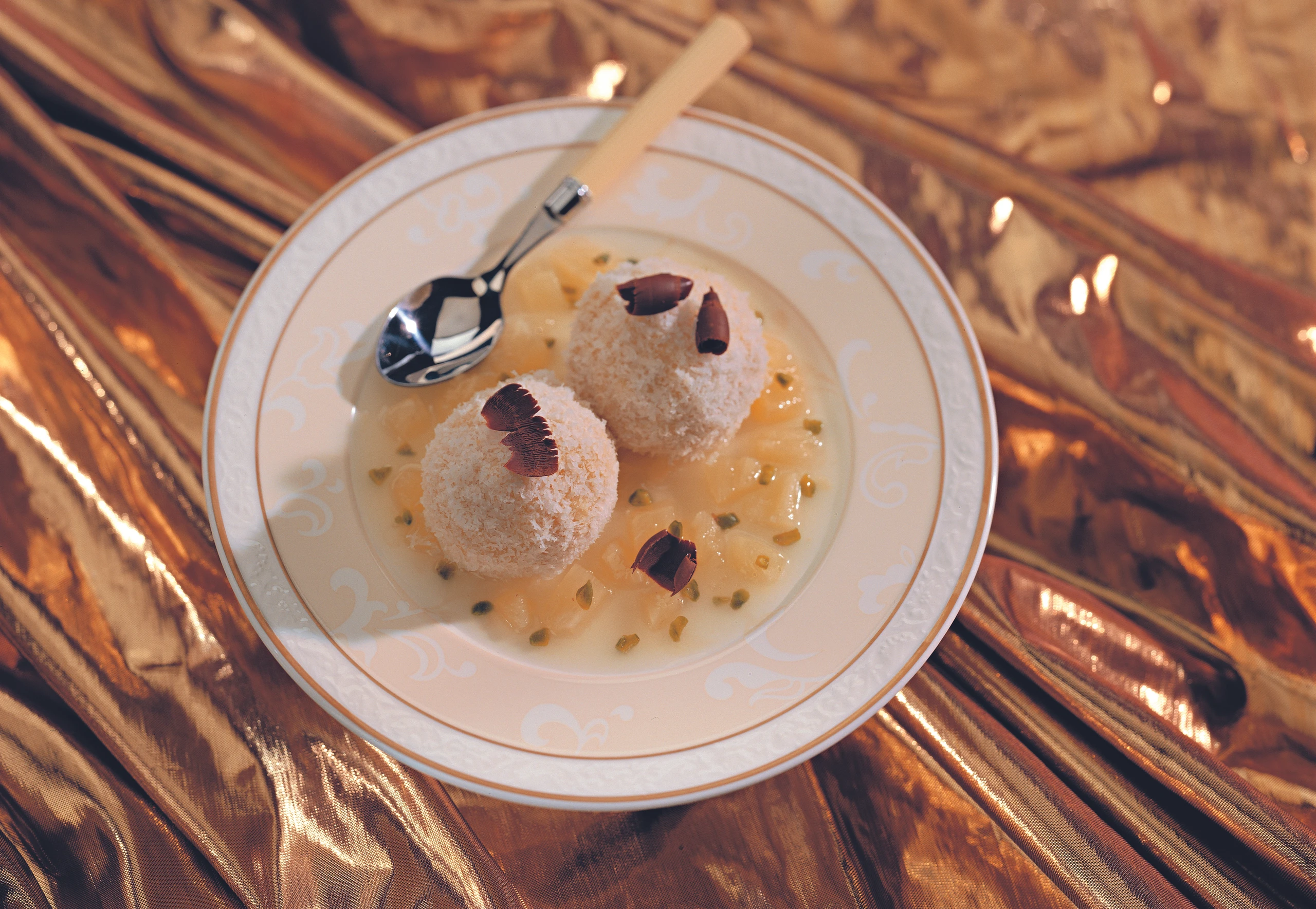 Kokosette in eine flache Schüssel geben, Knödel mit einem Siebschöpfer aus dem Wasser heben, gut abtropfen lassen und in Kokosette wälzen. Knödel mit der Sauce anrichten und mit geschabter Schokolade garniert servieren.