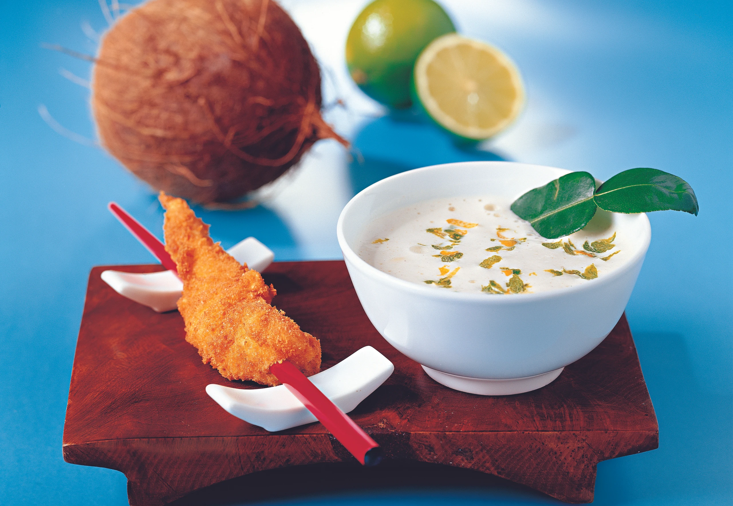 Kokos-Limettensuppe mit Zitrus-Backhendl