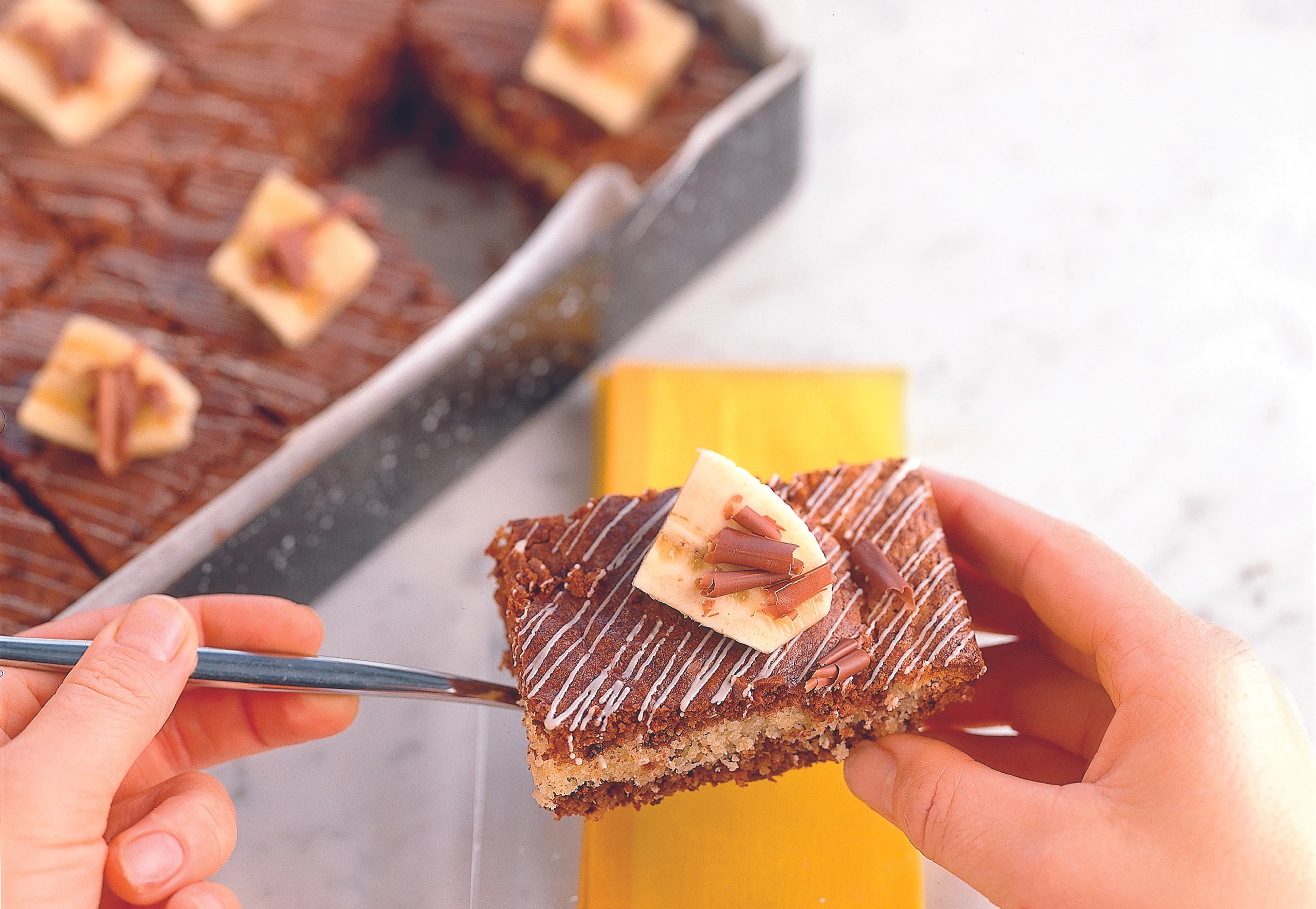 Weiße Kuvertüre hacken und im Wasserbad schmelzen. In ein kleines Papierstanitzel füllen und den Kuchen damit garnieren. Kuchen mit Bananenstücken und Schokospänen garnieren.
