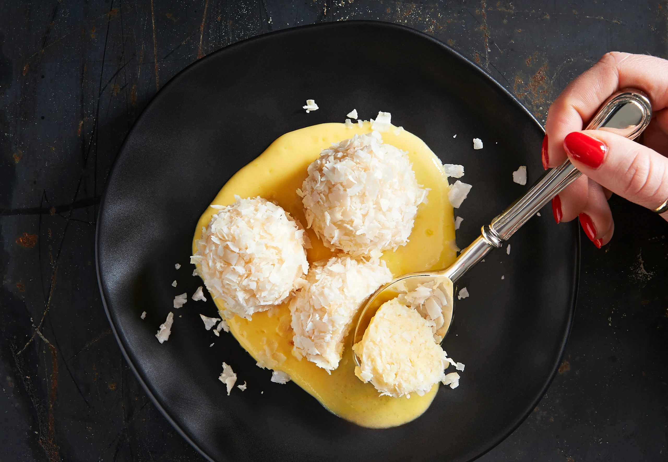 Knödel mit einem Gitterlöffel aus dem Kochwasser heben, abtropfen lassen und im Kokosette wälzen. Knödel mit der Sauce anrichten.