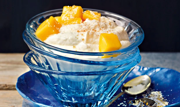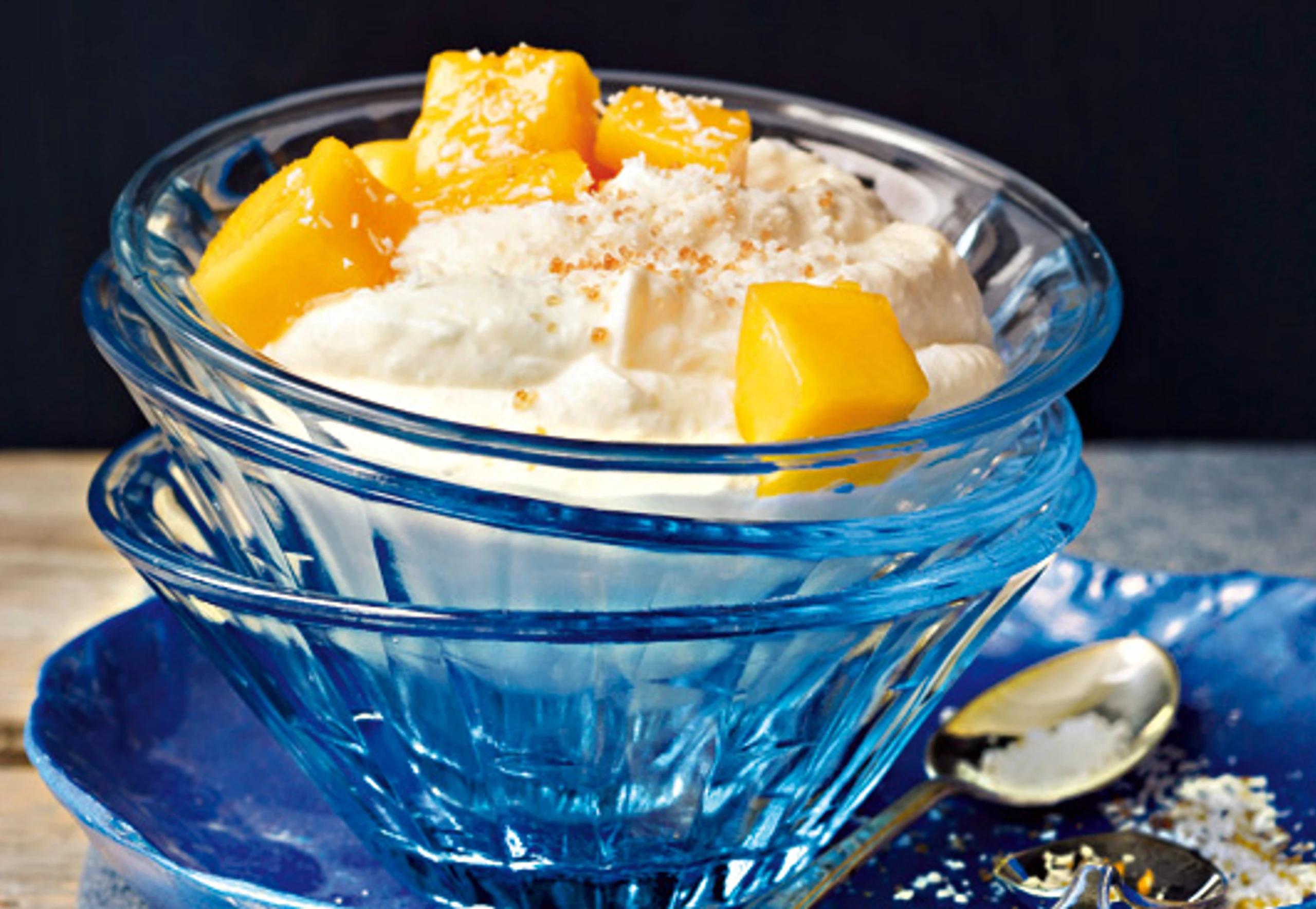 - Kokoscreme in Dessertschüsseln anrichten, mit Mangowürfeln garnieren, mit Kokosette und braunem Zucker bestreuen.