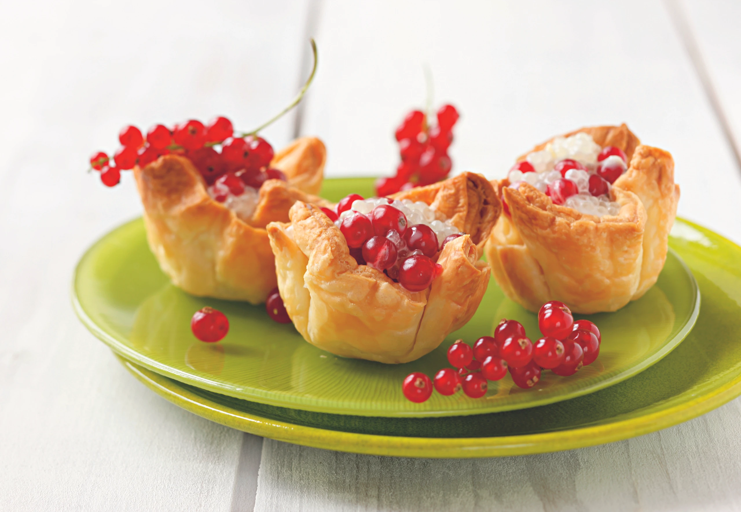 Ribiseln abrebeln. Teigschüsserln behutsam aus den Förmchen lösen. Kokoscreme mit einem Löffel in die Teigschüsserln füllen, Ribiseln darauf verteilen. Törtchen eventuell mit Ribiselrispen garnieren.