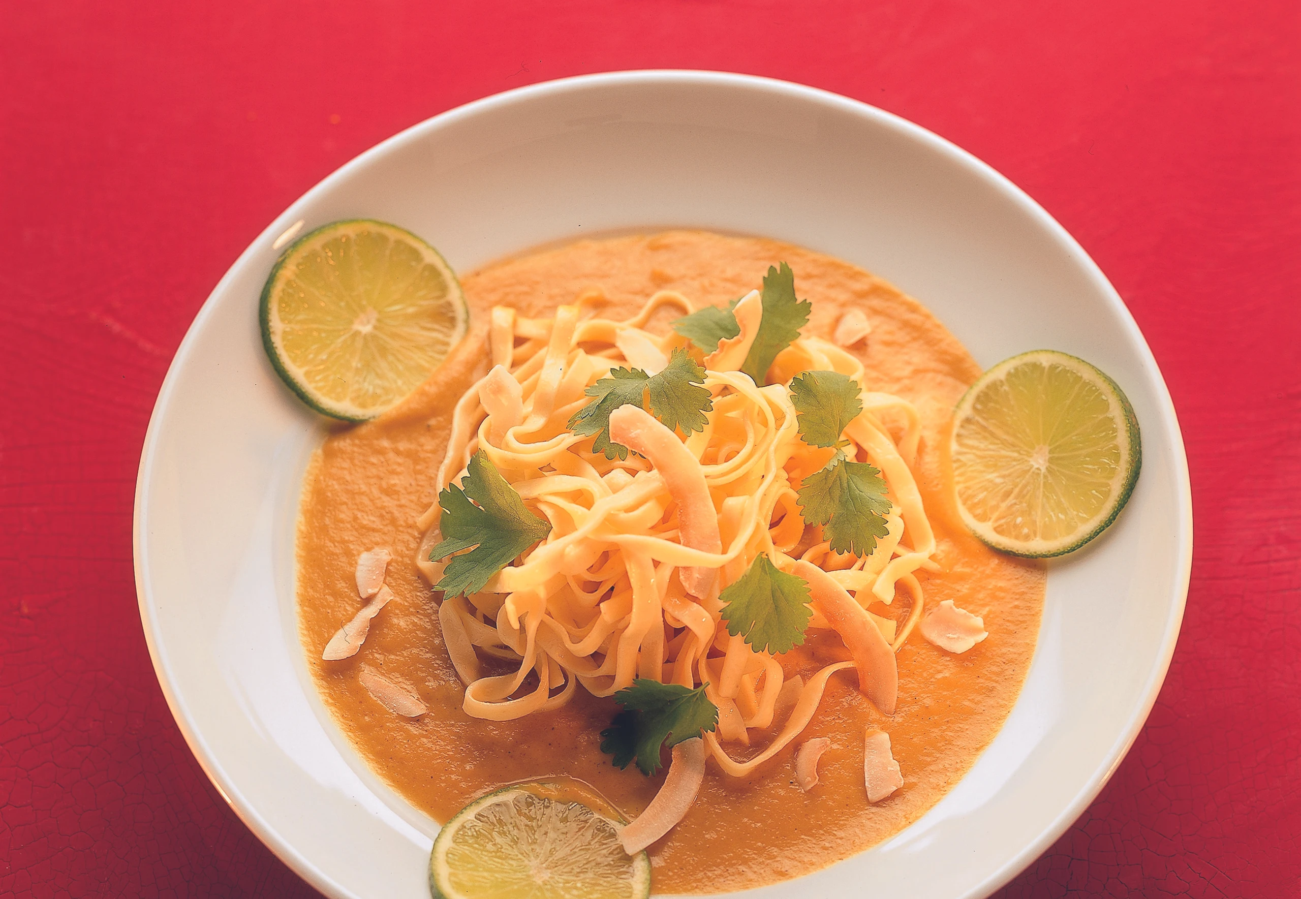 - Curry nochmals aufkochen und in Suppentellern anrichten. Tagliatelle darauf geben, mit Limettenscheiben, Kokosflocken und Koriander garniert servieren.