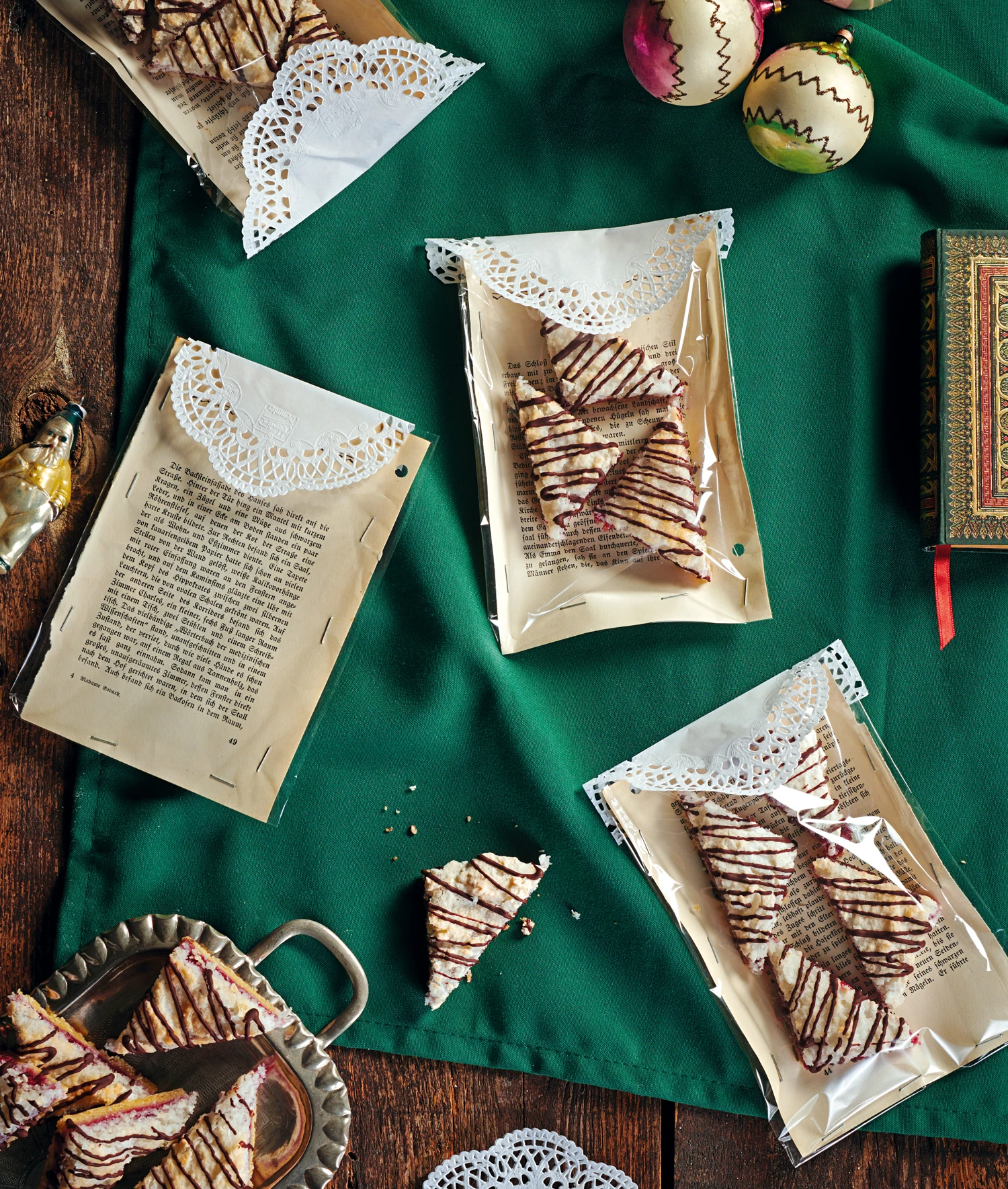 Kokosecken in Rechtecke schneiden und jedes Rechteck diagonal halbieren. Mit der Kuvertüre verzieren. In einer Keksdose aufbewahren.