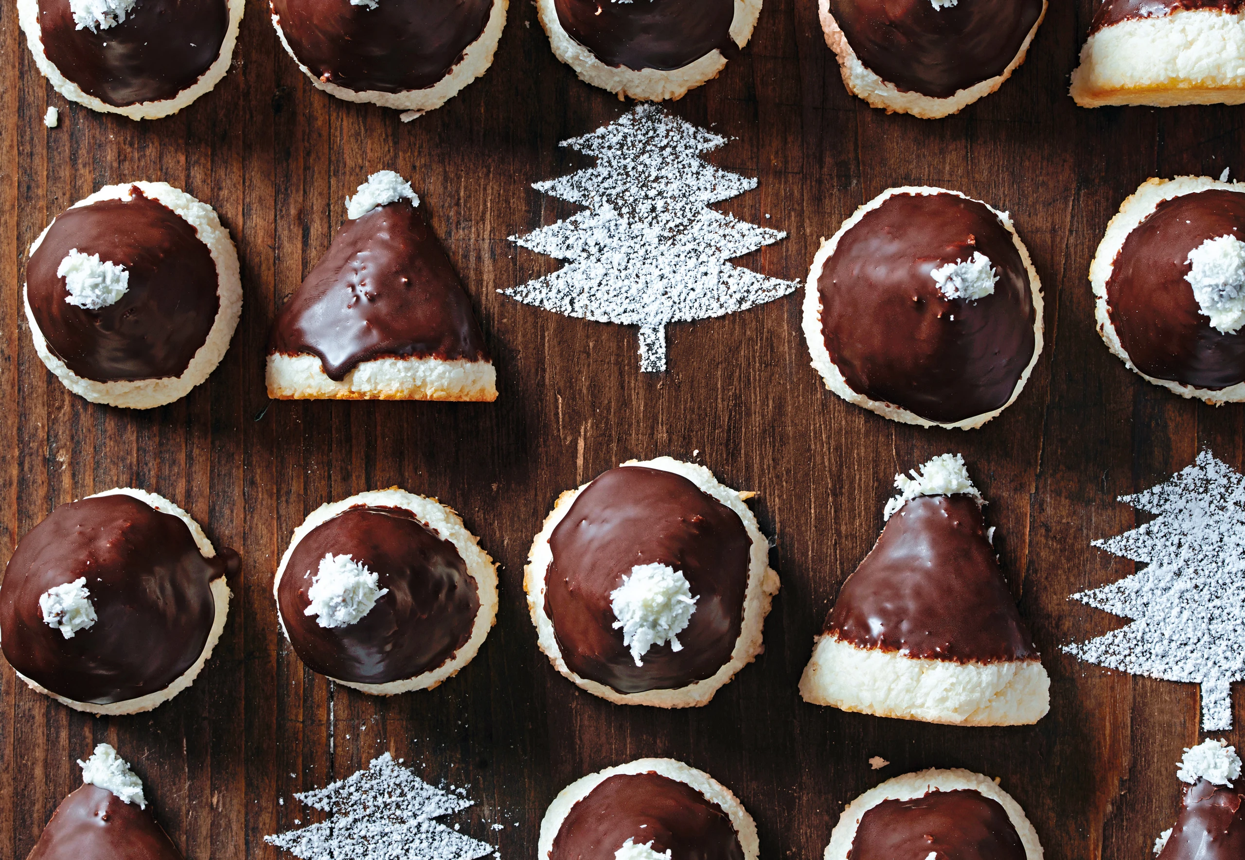 Weiße Kuvertüre über einem Wasserbad schmelzen. Keksspitzen in die weiße Kuvertüre, dann in Kokosette tunken. Kokoshauberl trocknen lassen.