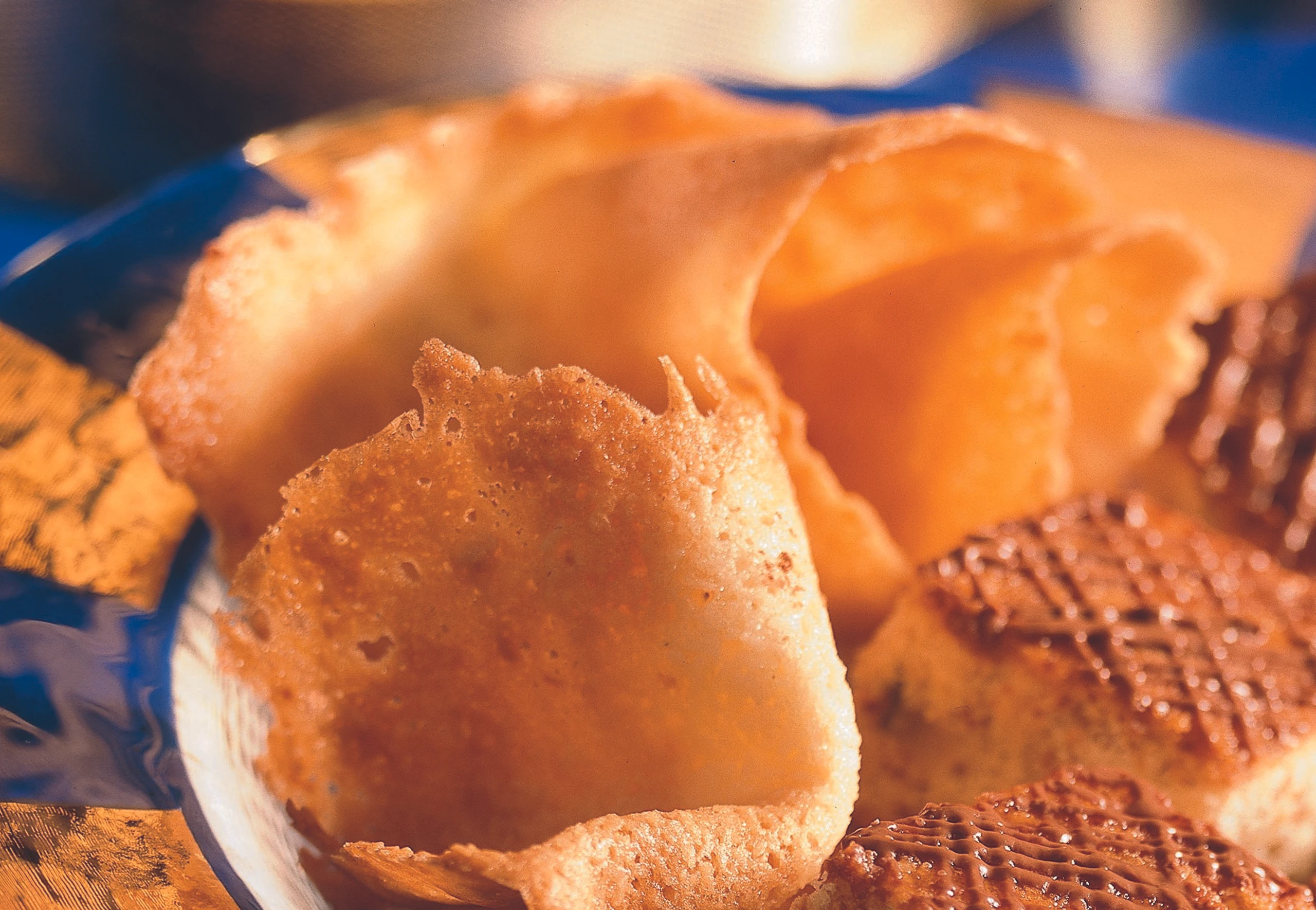 Mit einem Löffel wenig Masse auf das Backpapier geben, mit einer Palette (ideal ist eine Winkelpalette) gleichmäßig dünn verstreichen (Ø 6–7 cm). Papier auf das Blech ziehen und die Masse im vorgeheizten Rohr (mittlere Schiene) ca. 10 Minuten goldgelb backen.