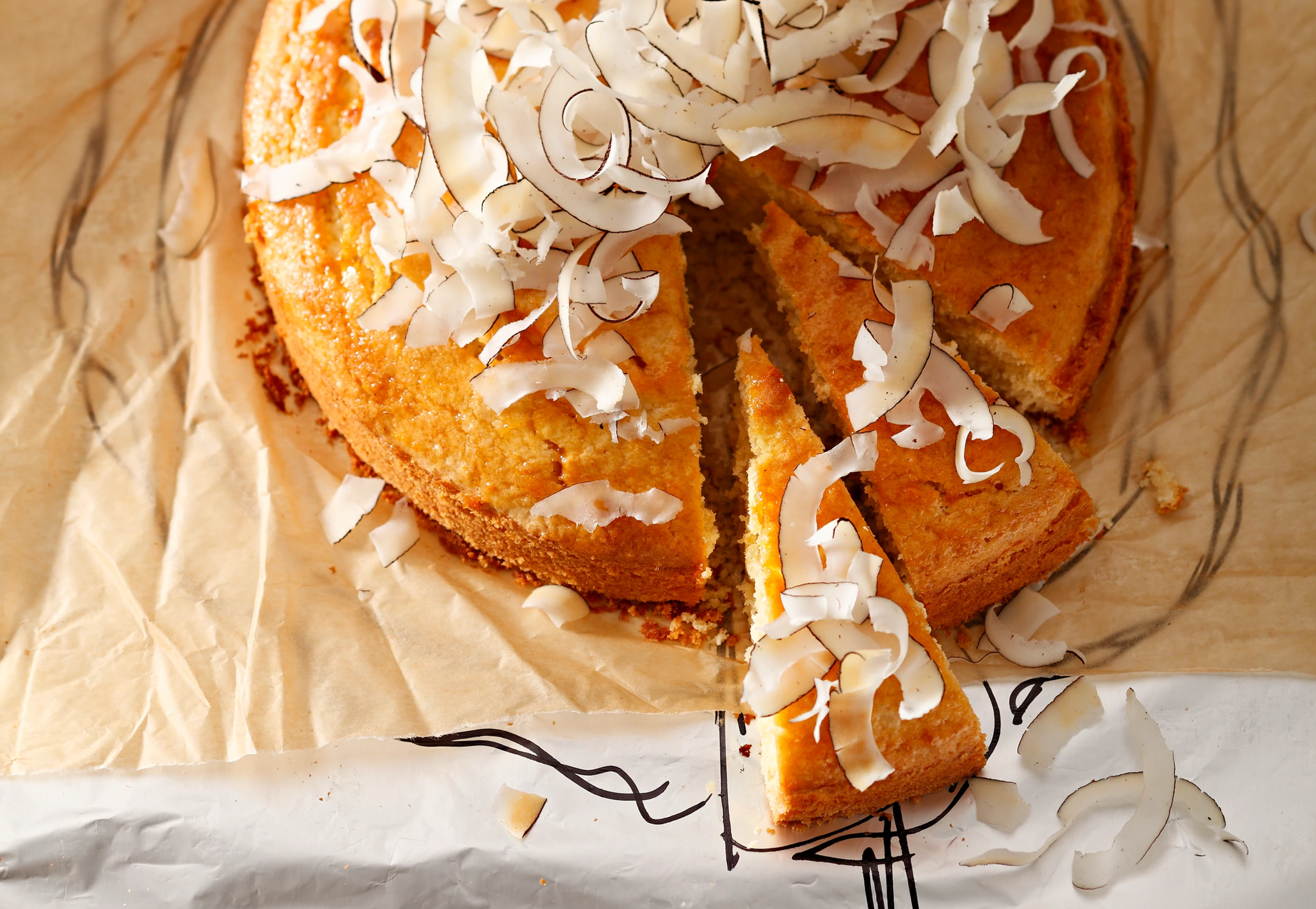 Temperatur auf 160°C erhöhen. Tortenform (Ø 24 cm) mit Butter ausstreichen, mit Mehl ausstreuen. Mehl, Backpulver und Stärke versieben. Butter und Zucker schaumig schlagen, die verquirlten Eier in kleinen Mengen nach und nach untermischen, Rum zugeben. Zuerst Mehlmischung, dann Kokosette und Mascarpone zugeben und glatt rühren. Orangen- und Zitronenschale sowie -saft unterrühren.