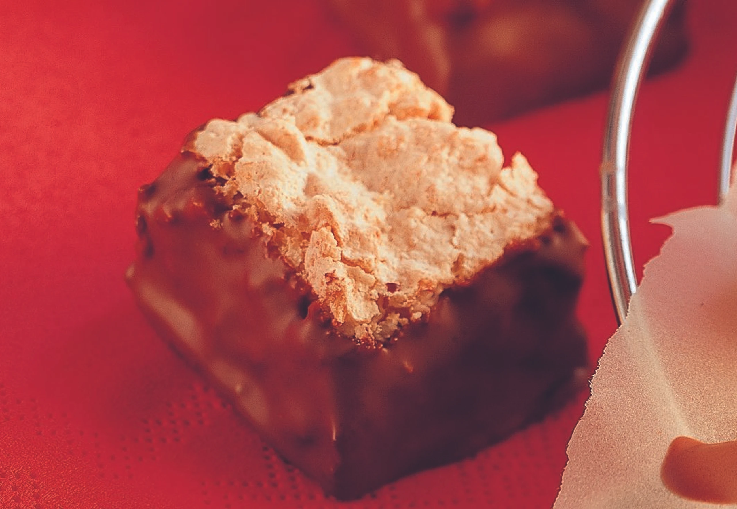 Die Kokosschnitten so tief in Schokoladeglasur tauchen, dass die Kanten mit Schokolade überzogen sind. Schnitten abtropfen und auf Backpapier trocknen lassen.