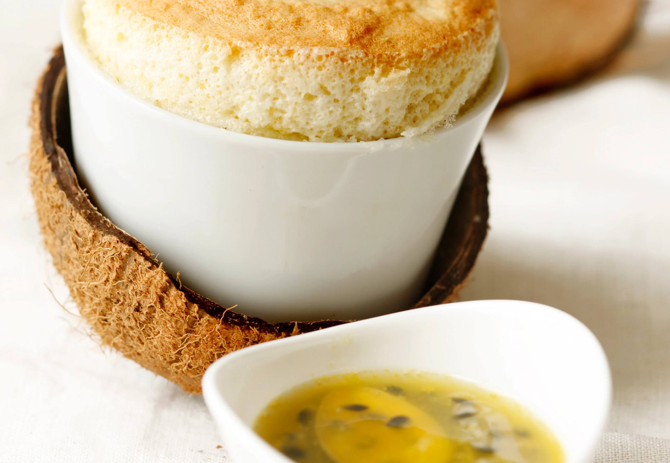 Mehl mit Kokosette vermischen. Eier trennen. Kokosmilch mit Butter, Likör und 1 kleinen Prise Salz aufkochen. Mehlmischung unter Rühren einrieseln lassen. Masse bei schwacher Hitze rühren, bis sie sich vom Geschirrboden löst. Umfüllen und ein wenig abkühlen lassen. Dotter nach und nach einrühren. Eiklar mit 40 g vom Zucker zu festem Schnee schlagen. Ein Drittel vom Schnee unter die Masse rühren, übrigen unterheben. Masse in die Förmchen füllen. Förmchen auf das Blech stellen. Soufflés im Rohr ca. 20 Minuten backen.