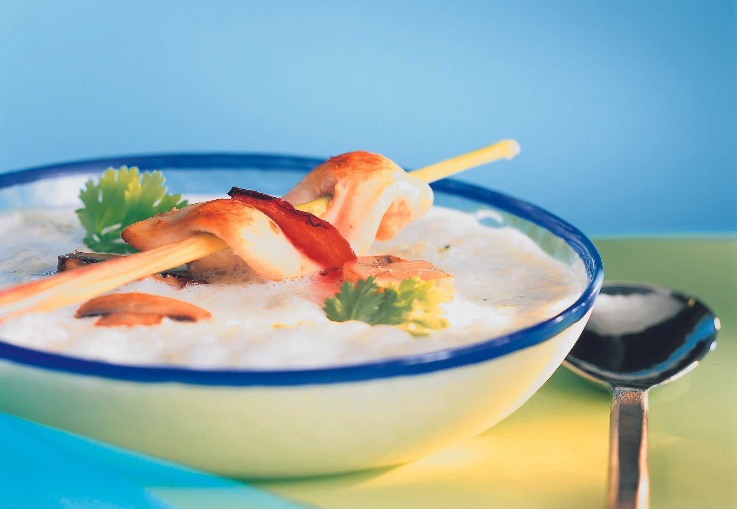 Kokossuppe mit Zitronengras und Hühnerspieß