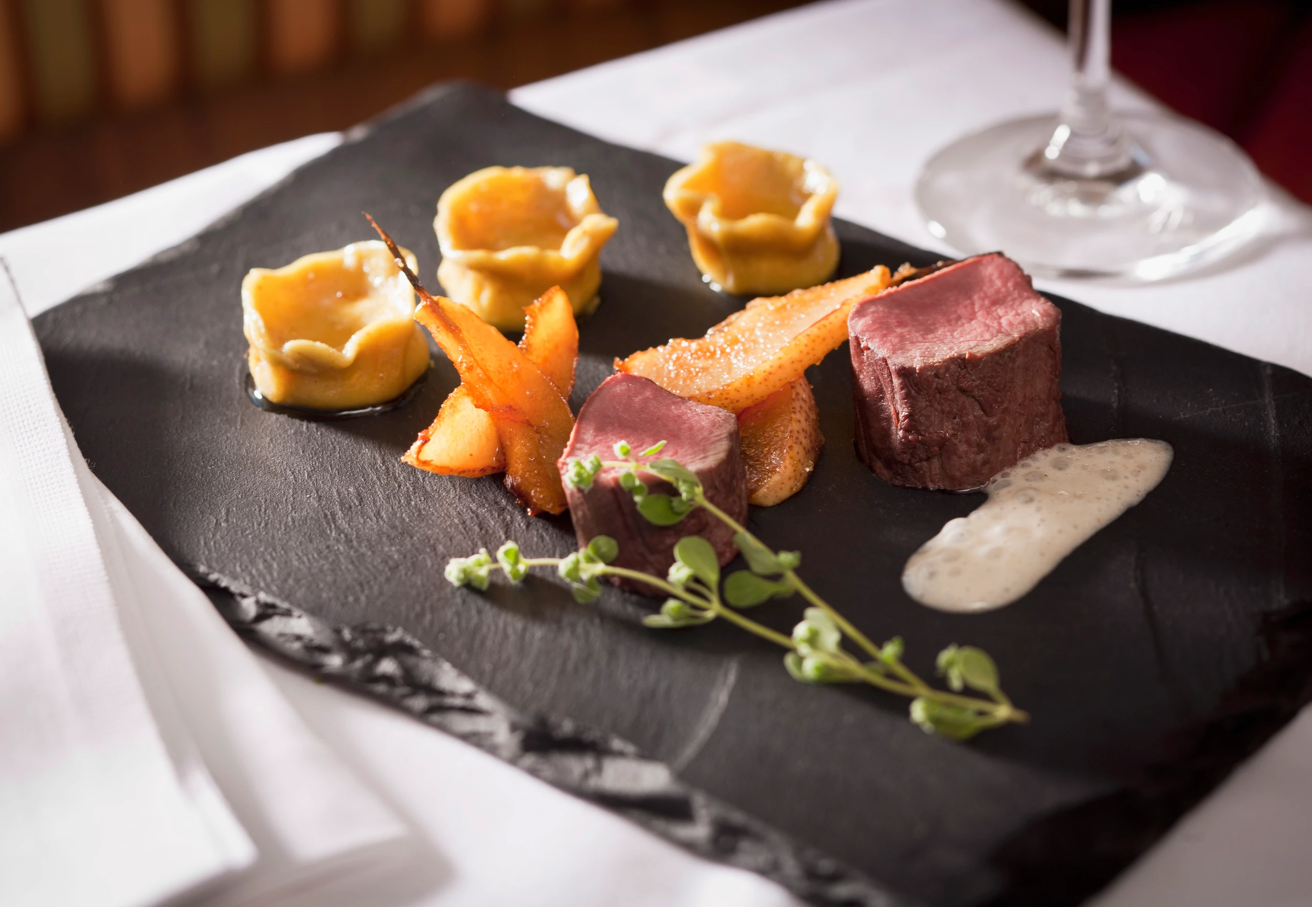 Konfiertes Rehfilet mit Frischkäseravioli