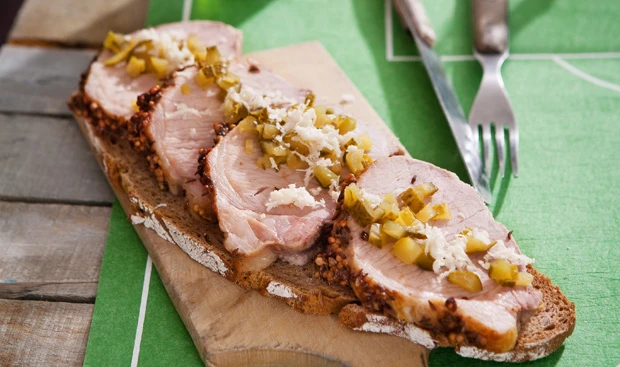 - Braten aus dem Rohr nehmen, etwas abkühlen lassen, Spagat entfernen. Fleisch in dünne Scheiben schneiden und auf die Brote legen. Mit Gurkerln und Kren bestreuen.