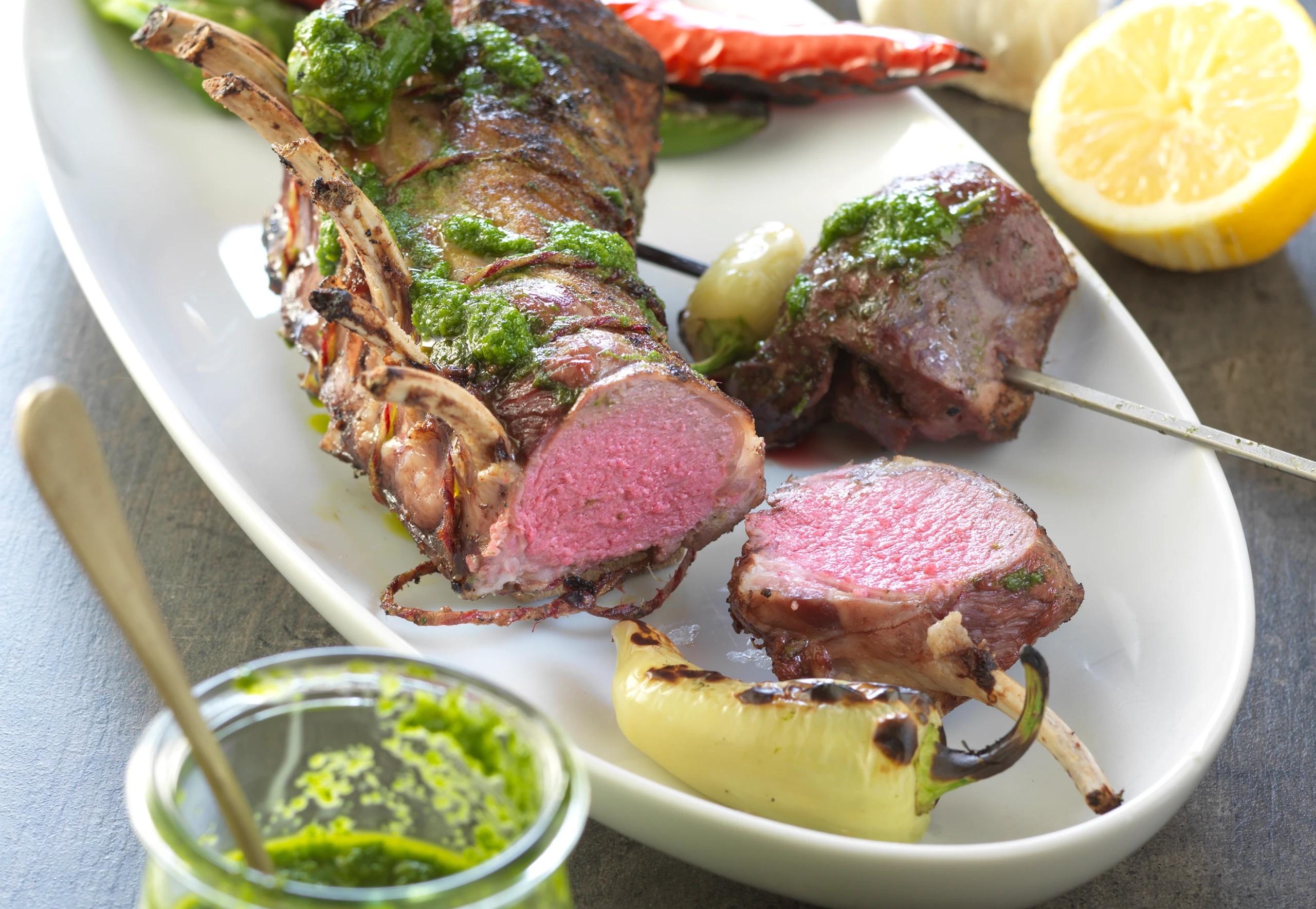 Karree und Herzen kurz auf die heiße Zone legen und knusprig grillen. Vor dem Servieren mit wenig von der Chimichurri-Sauce einstreichen.