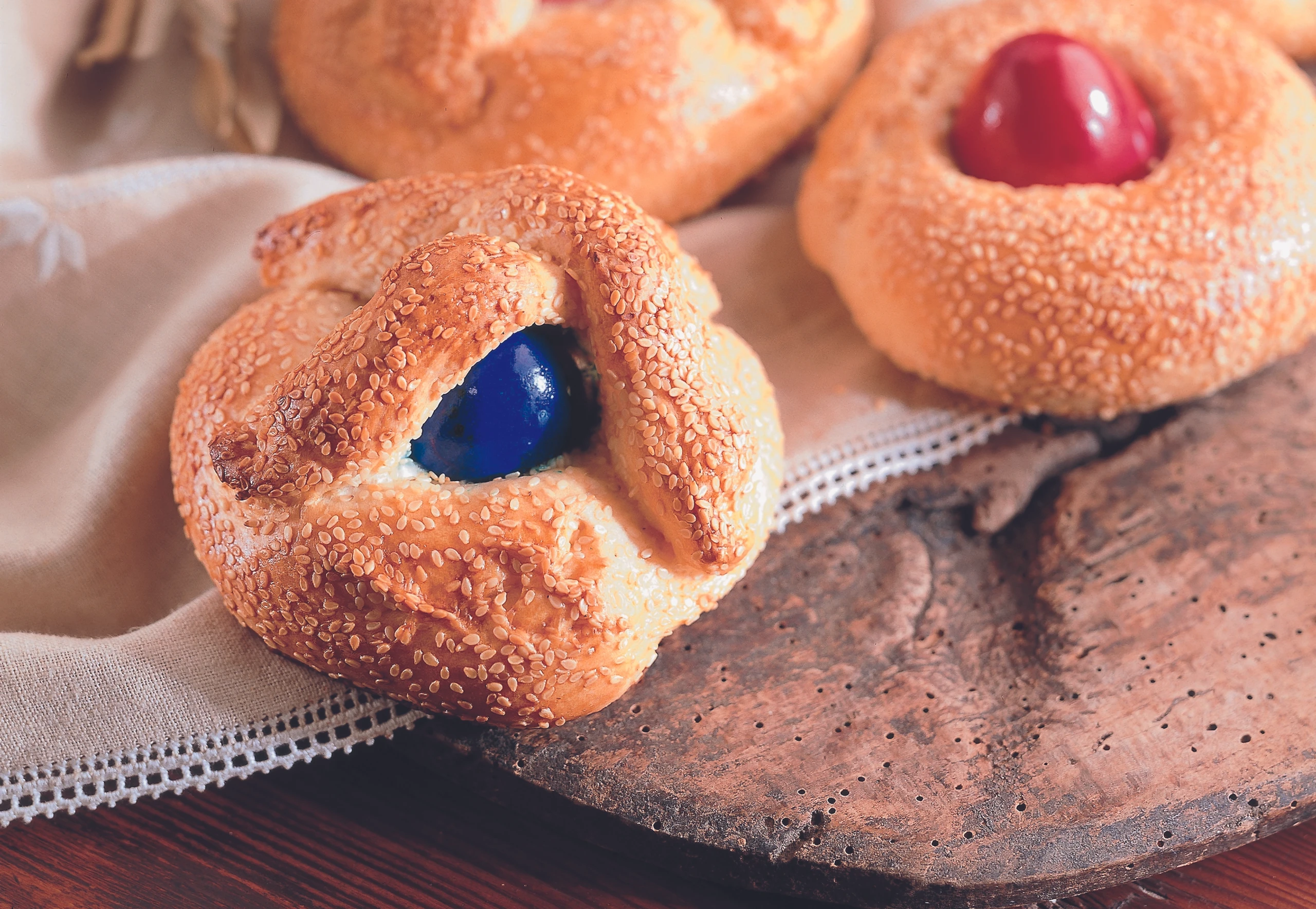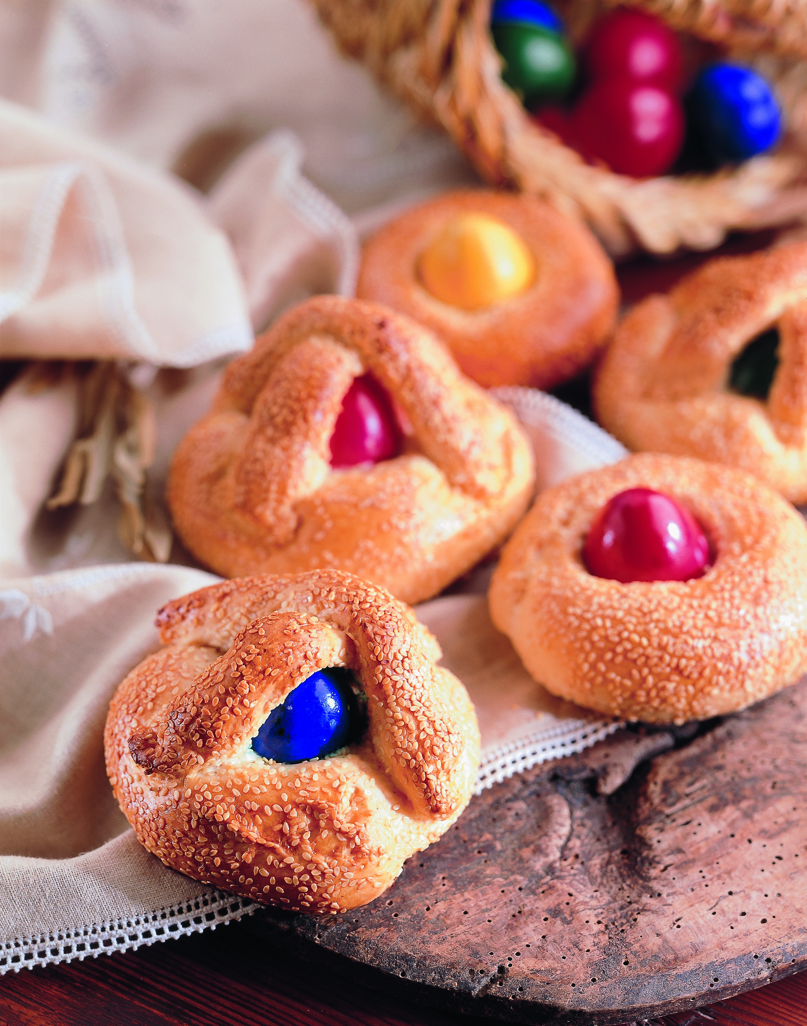 Teig in 6 Portionen teilen, daraus jeweils eine dickere und 2 dünne Rollen formen. Dickere um das Ei legen, die dünnen als Kreuz darüber legen. Teig mit Ei bestreichen, mit Sesam bestreuen und 30 Minuten rasten lassen.